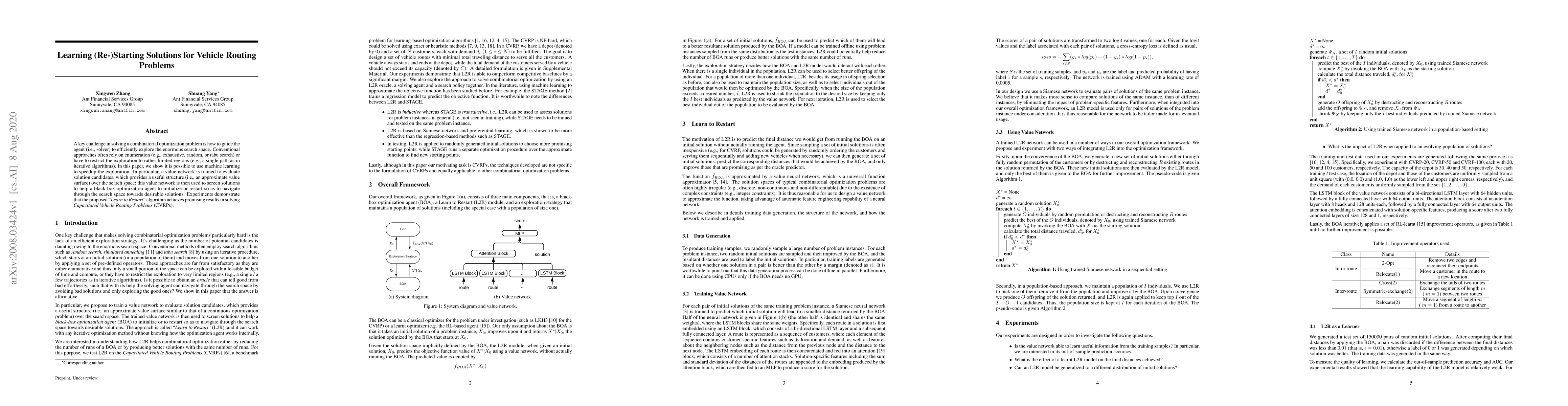 A key challenge in solving a combinatorial optimization problem is how to guide the agent (i.e., solver) to efficiently explore the enormous search space. Conventional approaches often rely on enumeration (e.g., exhaustive, random, or tabu search) or have to restrict the exploration to rather limited regions (e.g., a single path as in iterative algorithms). In this paper, we show it is possible to use machine learning to speedup the exploration. In particular, a value network is trained to evaluate solution candidates, which provides a useful structure (i.e., an approximate value surface) over the search space; this value network is then used to screen solutions to help a black-box optimization agent to initialize or restart so as to navigate through the search space towards desirable solutions. Experiments demonstrate that the proposed ``Learn to Restart'' algorithm achieves promising results in solving Capacitated Vehicle Routing Problems (CVRPs).