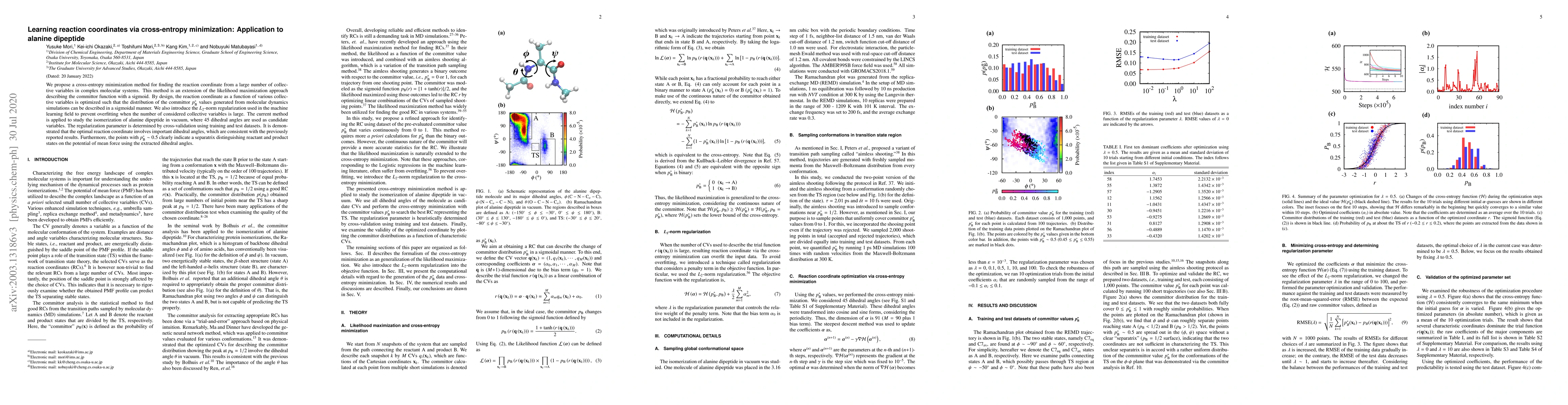This paper proposes a cross-entropy minimization method to determine reaction coordinates in complex molecular systems, extending the likelihood maximization approach. The method optimizes collective variables to describe committor distributions in a sigmoidal manner, applying $L_2$-norm regularization to prevent overfitting. The approach is demonstrated on alanine dipeptide isomerization, revealing significant dihedral angles and identifying a separatrix between reactant and product states.