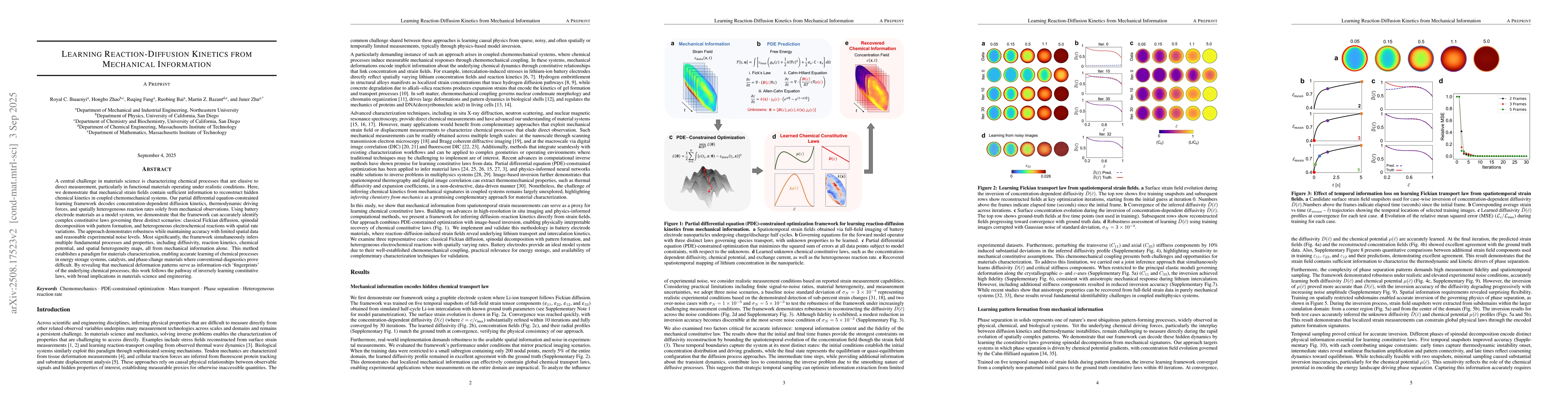A central challenge in materials science is characterizing chemical processes that are elusive to direct measurement, particularly in functional materials operating under realistic conditions. Here, we demonstrate that mechanical strain fields contain sufficient information to reconstruct hidden chemical kinetics in coupled chemomechanical systems. Our partial differential equation-constrained learning framework decodes concentration-dependent diffusion kinetics, thermodynamic driving forces, and spatially heterogeneous reaction rates solely from mechanical observations. Using battery electrode materials as a model system, we demonstrate that the framework can accurately identify complex constitutive laws governing three distinct scenarios: classical Fickian diffusion, spinodal decomposition with pattern formation, and heterogeneous electrochemical reactions with spatial rate variations. The approach demonstrates robustness while maintaining accuracy with limited spatial data and reasonable experimental noise levels. Most significantly, the framework simultaneously infers multiple fundamental processes and properties, including diffusivity, reaction kinetics, chemical potential, and spatial heterogeneity maps, all from mechanical information alone. This method establishes a paradigm for materials characterization, enabling accurate learning of chemical processes in energy storage systems, catalysts, and phase-change materials where conventional diagnostics prove difficult. By revealing that mechanical deformation patterns serve as information-rich fingerprints of the underlying chemical processes, this work follows the pathway of inversely learning constitutive laws, with broad implications in materials science and engineering.