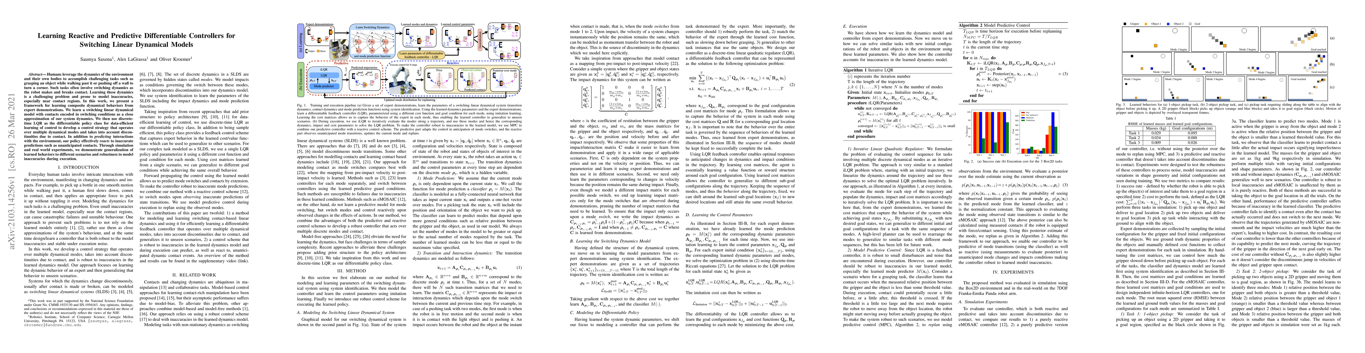 Humans leverage the dynamics of the environment and their own bodies to accomplish challenging tasks such as grasping an object while walking past it or pushing off a wall to turn a corner. Such tasks often involve switching dynamics as the robot makes and breaks contact. Learning these dynamics is a challenging problem and prone to model inaccuracies, especially near contact regions. In this work, we present a framework for learning composite dynamical behaviors from expert demonstrations. We learn a switching linear dynamical model with contacts encoded in switching conditions as a close approximation of our system dynamics. We then use discrete-time LQR as the differentiable policy class for data-efficient learning of control to develop a control strategy that operates over multiple dynamical modes and takes into account discontinuities due to contact. In addition to predicting interactions with the environment, our policy effectively reacts to inaccurate predictions such as unanticipated contacts. Through simulation and real world experiments, we demonstrate generalization of learned behaviors to different scenarios and robustness to model inaccuracies during execution.