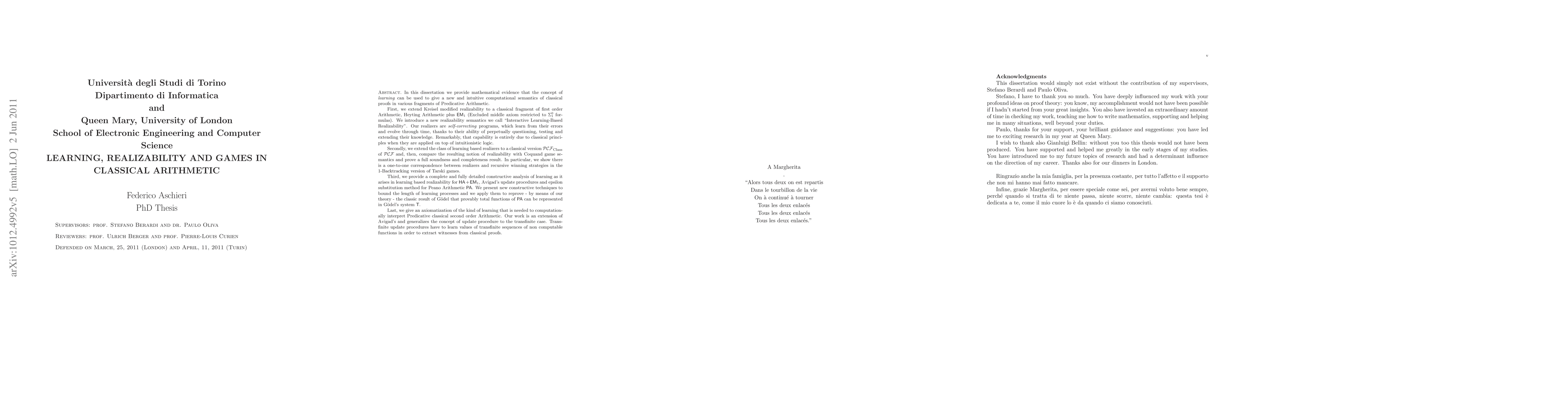 In this dissertation we provide mathematical evidence that the concept of learning can be used to give a new and intuitive computational semantics of classical proofs in various fragments of Predicative Arithmetic. First, we extend Kreisel modified realizability to a classical fragment of first order Arithmetic, Heyting Arithmetic plus EM1 (Excluded middle axiom restricted to Sigma^0_1 formulas). We introduce a new realizability semantics we call "Interactive Learning-Based Realizability". Our realizers are self-correcting programs, which learn from their errors and evolve through time. Secondly, we extend the class of learning based realizers to a classical version PCFclass of PCF and, then, compare the resulting notion of realizability with Coquand game semantics and prove a full soundness and completeness result. In particular, we show there is a one-to-one correspondence between realizers and recursive winning strategies in the 1-Backtracking version of Tarski games. Third, we provide a complete and fully detailed constructive analysis of learning as it arises in learning based realizability for HA+EM1, Avigad's update procedures and epsilon substitution method for Peano Arithmetic PA. We present new constructive techniques to bound the length of learning processes and we apply them to reprove - by means of our theory - the classic result of Godel that provably total functions of PA can be represented in Godel's system T. Last, we give an axiomatization of the kind of learning that is needed to computationally interpret Predicative classical second order Arithmetic. Our work is an extension of Avigad's and generalizes the concept of update procedure to the transfinite case. Transfinite update procedures have to learn values of transfinite sequences of non computable functions in order to extract witnesses from classical proofs.