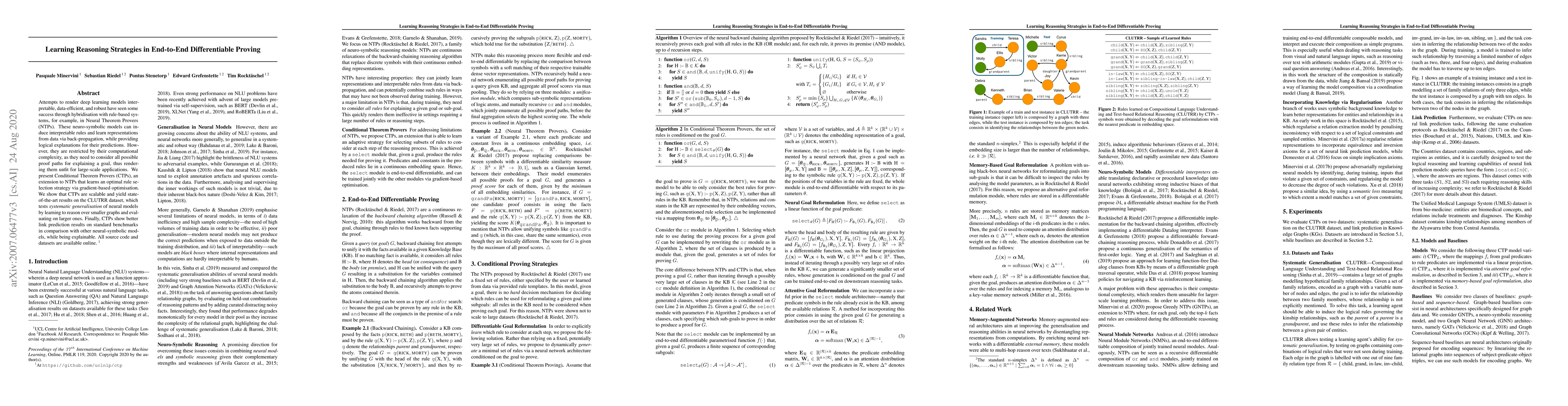 The paper introduces Conditional Theorem Provers (CTPs), an extension of Neural Theorem Provers (NTPs) that learns optimal rule selection strategies via gradient-based optimization. CTPs are shown to be scalable, achieving state-of-the-art results on the CLUTRR dataset and outperforming other neural-symbolic models in link prediction tasks, while maintaining explainability.