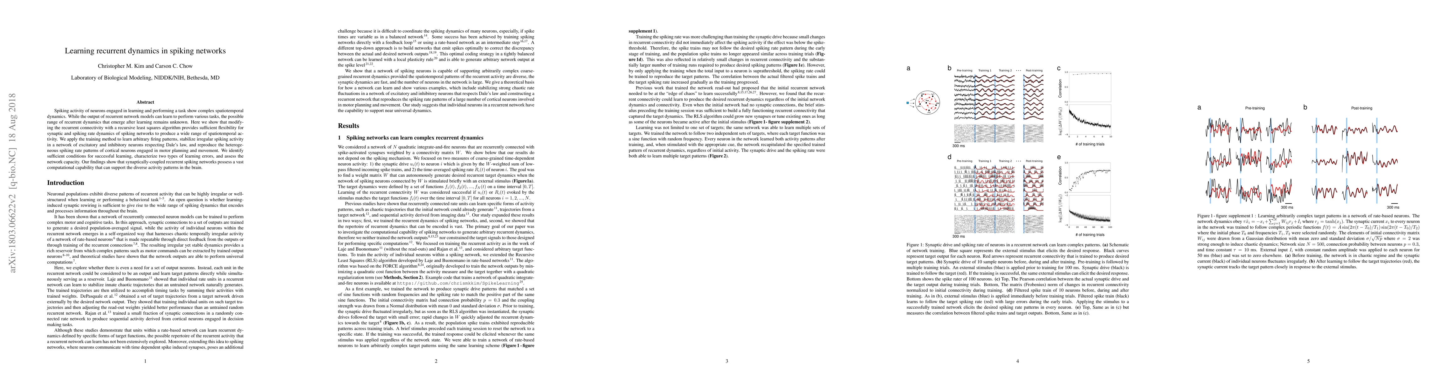 This paper explores how modifying recurrent connectivity in spiking networks using a recursive least squares algorithm can produce diverse spatiotemporal dynamics, enabling the networks to learn and stabilize various firing patterns, and reproduce the complex activity seen in cortical neurons during motor planning. The study identifies conditions for successful learning and highlights the networks' vast computational potential.