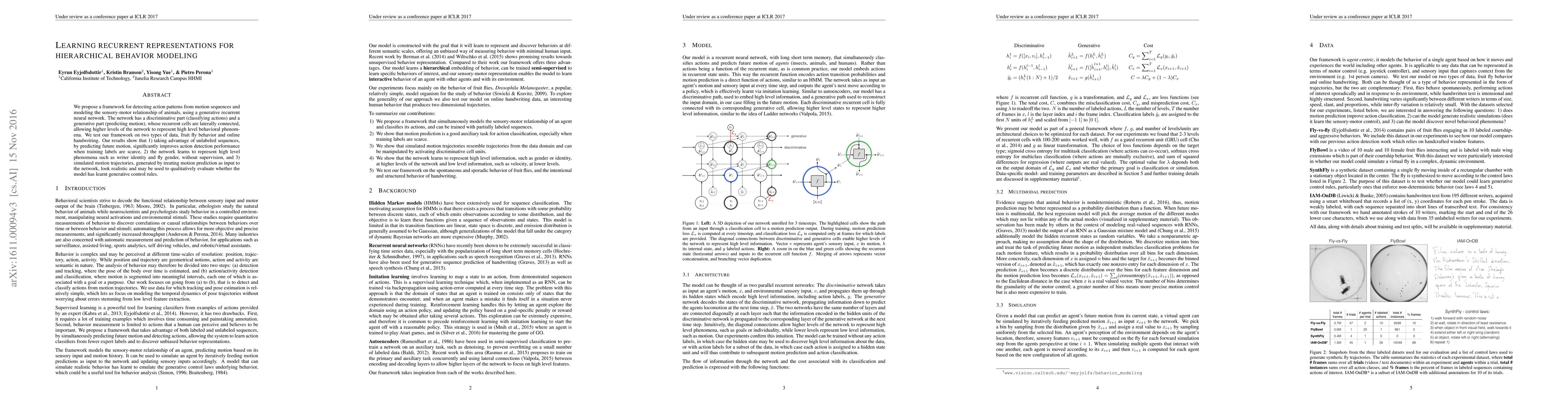 We propose a framework for detecting action patterns from motion sequences and modeling the sensory-motor relationship of animals, using a generative recurrent neural network. The network has a discriminative part (classifying actions) and a generative part (predicting motion), whose recurrent cells are laterally connected, allowing higher levels of the network to represent high level phenomena. We test our framework on two types of data, fruit fly behavior and online handwriting. Our results show that 1) taking advantage of unlabeled sequences, by predicting future motion, significantly improves action detection performance when training labels are scarce, 2) the network learns to represent high level phenomena such as writer identity and fly gender, without supervision, and 3) simulated motion trajectories, generated by treating motion prediction as input to the network, look realistic and may be used to qualitatively evaluate whether the model has learnt generative control rules.