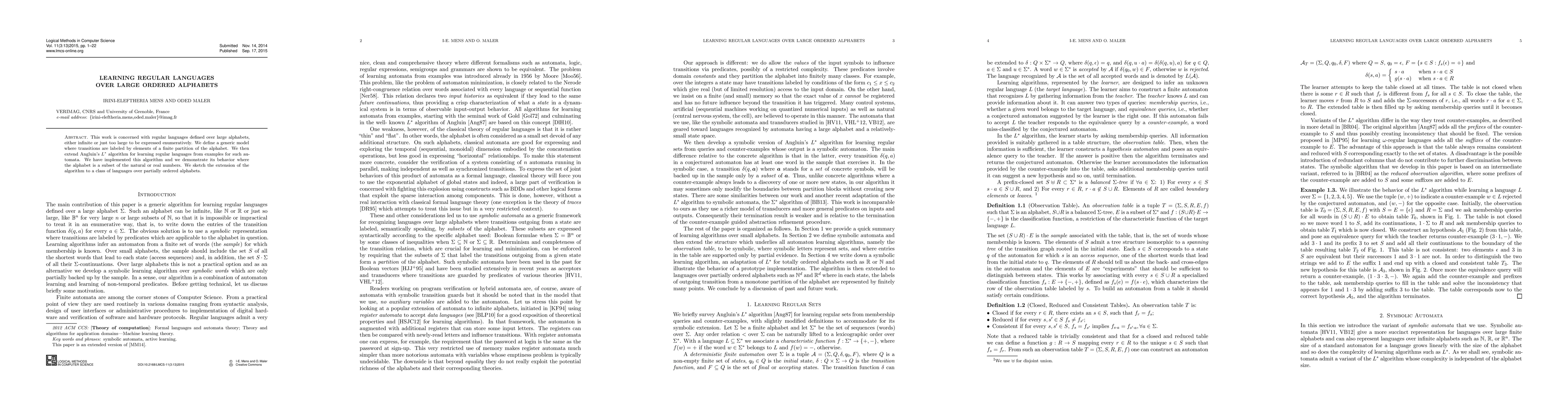 This paper proposes a model for learning regular languages over large or infinite alphabets by partitioning the alphabet into finite sets and extends Angluin's L* algorithm to handle these partitions. The authors demonstrate the practical implementation and behavior of their algorithm on subsets of natural and real numbers.