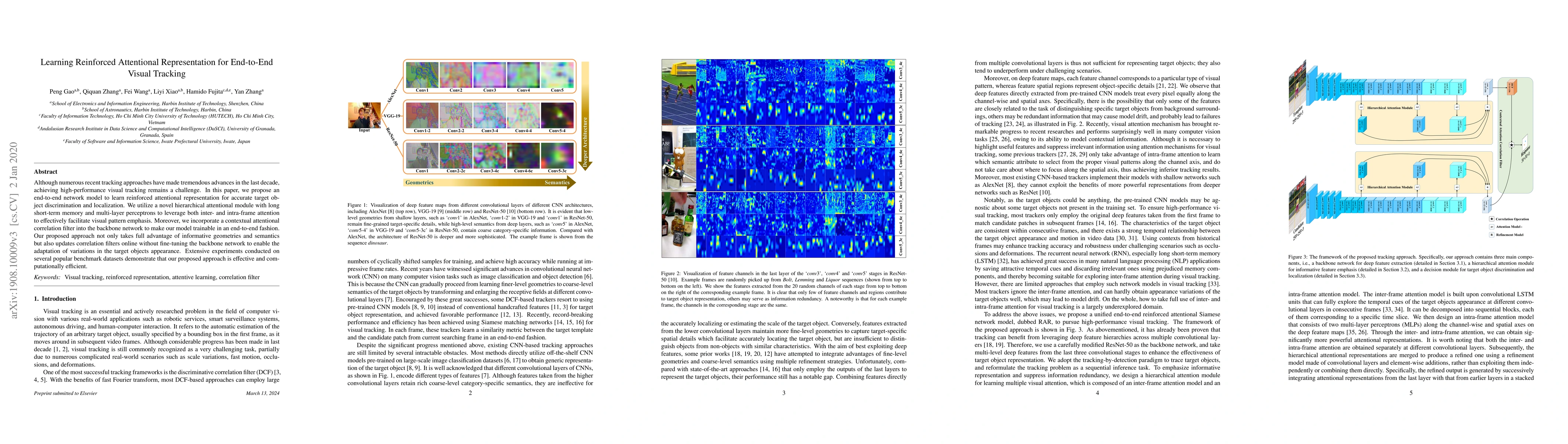 This paper proposes an end-to-end network model that employs reinforced attentional representation and a hierarchical attentional module to enhance visual tracking performance. The approach integrates contextual attentional correlation filters and updates correlation filters online without requiring network re-training, achieving effective adaptation and high performance on benchmark datasets.