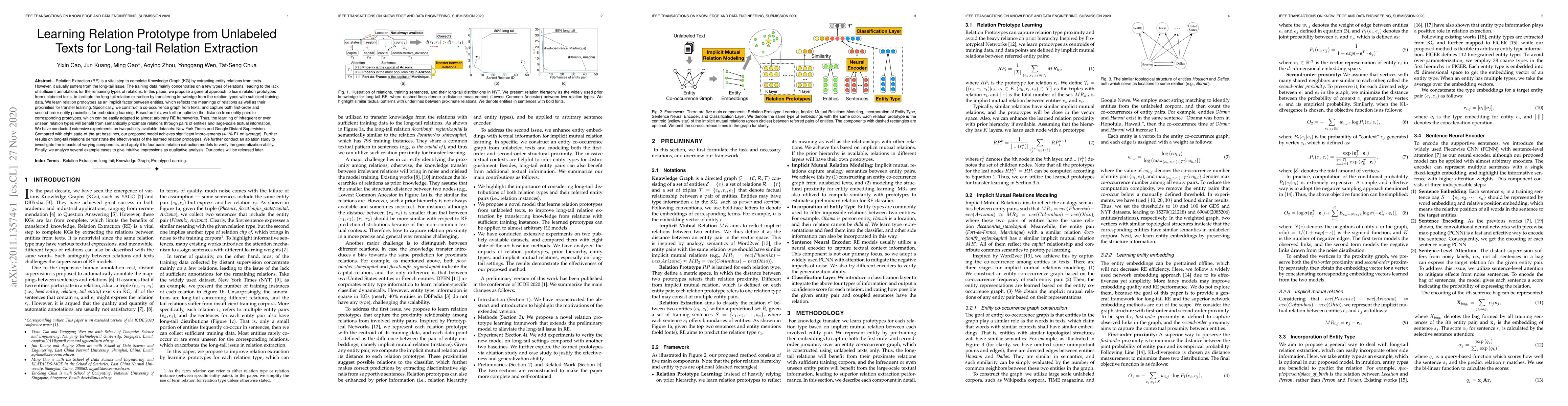 Relation Extraction (RE) is a vital step to complete Knowledge Graph (KG) by extracting entity relations from texts.However, it usually suffers from the long-tail issue. The training data mainly concentrates on a few types of relations, leading to the lackof sufficient annotations for the remaining types of relations. In this paper, we propose a general approach to learn relation prototypesfrom unlabeled texts, to facilitate the long-tail relation extraction by transferring knowledge from the relation types with sufficient trainingdata. We learn relation prototypes as an implicit factor between entities, which reflects the meanings of relations as well as theirproximities for transfer learning. Specifically, we construct a co-occurrence graph from texts, and capture both first-order andsecond-order entity proximities for embedding learning. Based on this, we further optimize the distance from entity pairs tocorresponding prototypes, which can be easily adapted to almost arbitrary RE frameworks. Thus, the learning of infrequent or evenunseen relation types will benefit from semantically proximate relations through pairs of entities and large-scale textual information.We have conducted extensive experiments on two publicly available datasets: New York Times and Google Distant Supervision.Compared with eight state-of-the-art baselines, our proposed model achieves significant improvements (4.1% F1 on average). Furtherresults on long-tail relations demonstrate the effectiveness of the learned relation prototypes. We further conduct an ablation study toinvestigate the impacts of varying components, and apply it to four basic relation extraction models to verify the generalization ability.Finally, we analyze several example cases to give intuitive impressions as qualitative analysis. Our codes will be released later.