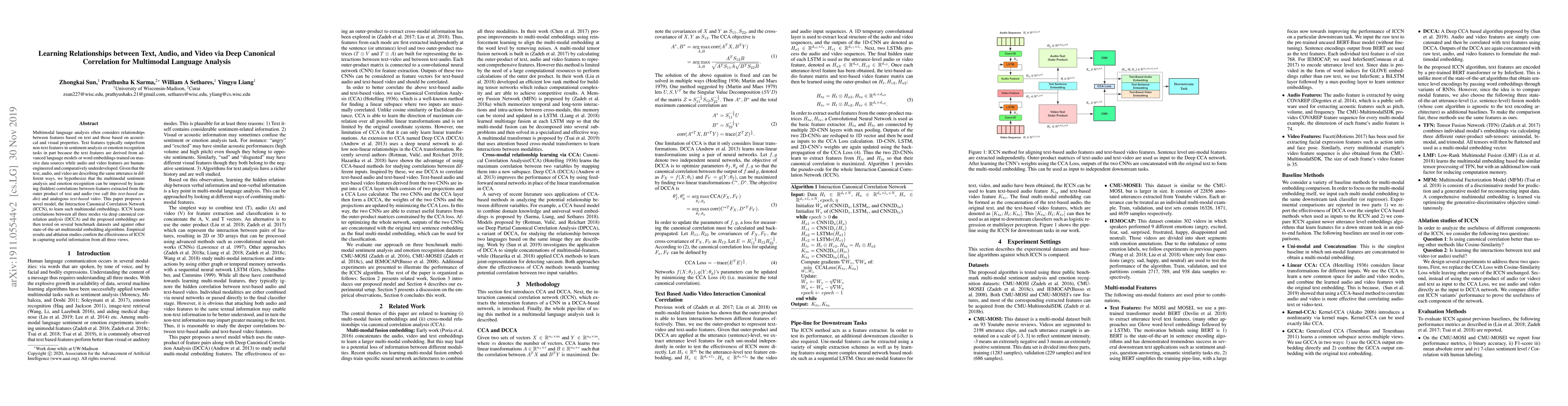 This paper proposes the Interaction Canonical Correlation Network (ICCN) to learn correlations between text, audio, and video features for multimodal language analysis. ICCN leverages deep canonical correlation analysis to improve multimodal sentiment analysis and emotion recognition by capturing hidden relationships between text-based audio and text-based video embeddings.