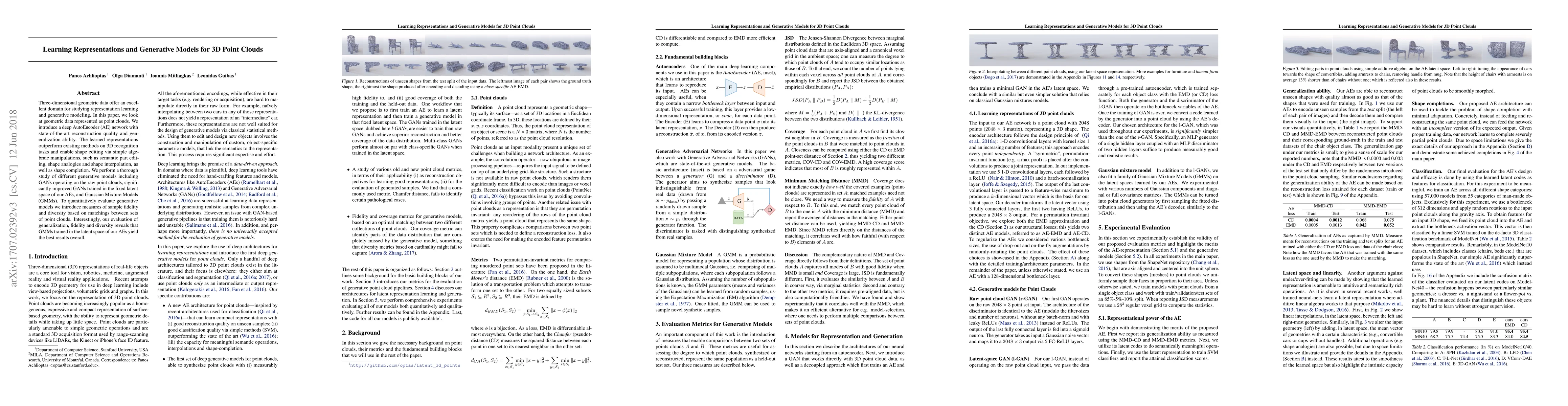 This paper introduces a deep AutoEncoder for learning representations from 3D point clouds, achieving superior reconstruction and generalization. It also explores generative models like GANs and GMMs, finding that GMMs trained in the AE's latent space provide the best balance of generalization, fidelity, and diversity.