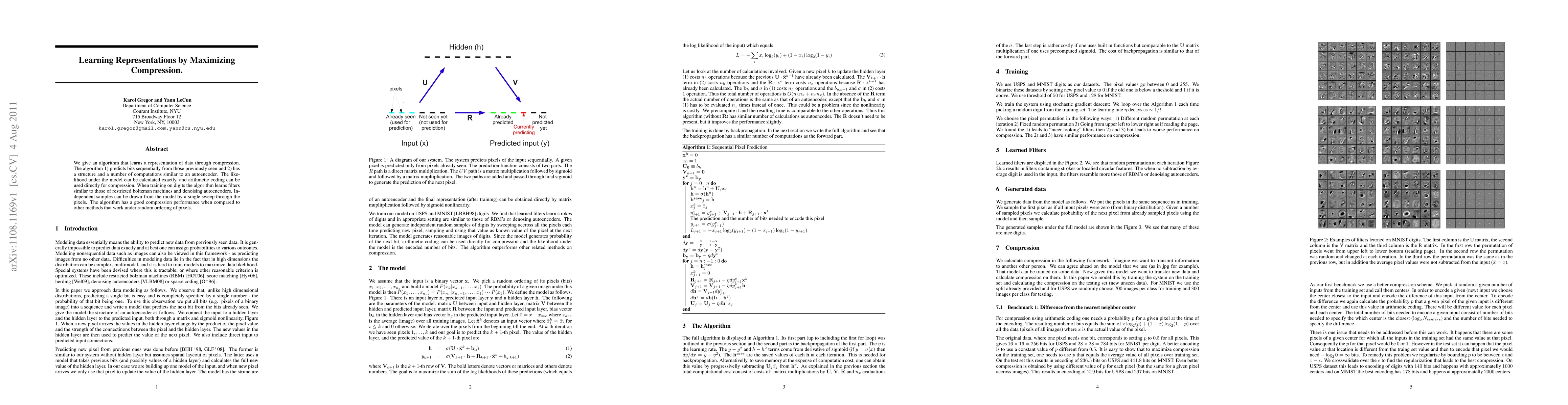 A new algorithm learns data representations by compressing it, achieving better performance than similar methods when pixels are ordered randomly. It generates filters similar to restricted boltzman machines and denoising autoencoders, allowing for independent sample generation with a single sweep through the pixels.