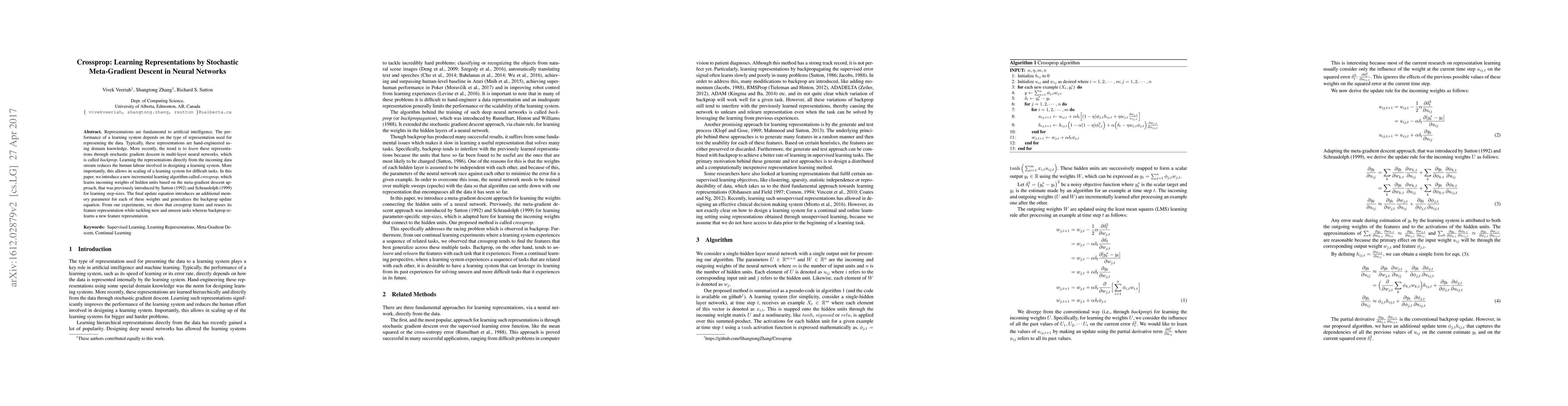 This paper introduces crossprop, a new incremental learning algorithm for neural networks that uses meta-gradient descent to update hidden unit weights, improving representation learning from data streams. Unlike backprop, crossprop effectively reuses learned features for new tasks.