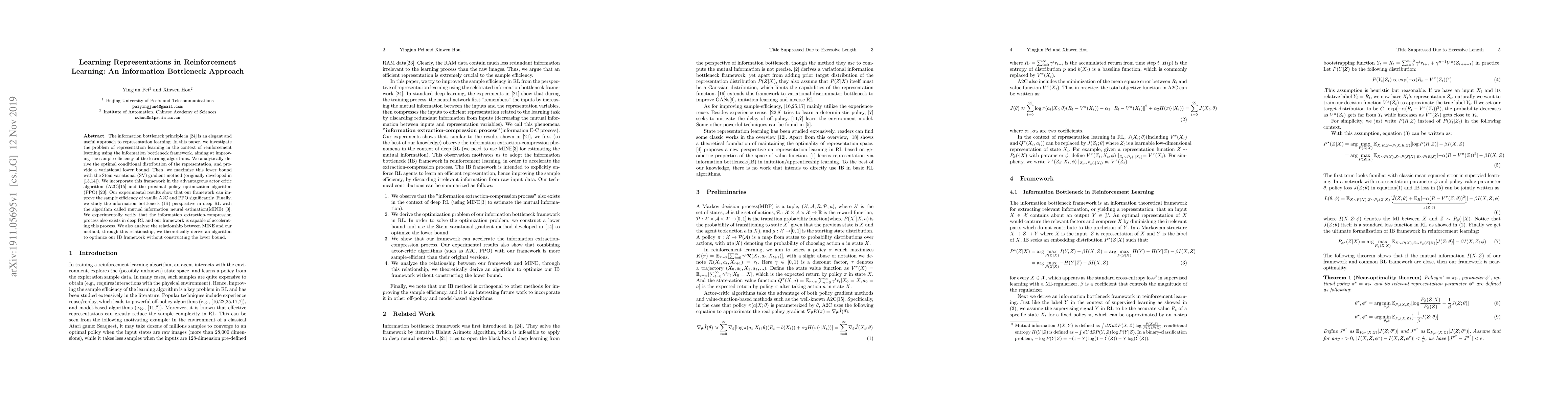 This paper explores applying the information bottleneck principle to enhance representation learning in reinforcement learning, aiming to boost sample efficiency. It introduces a variational lower bound and optimizes it using the Stein variational gradient method, demonstrating improved performance in A2C and PPO algorithms. The study also connects this approach to the mutual information neural estimation (MINE) algorithm, deriving a new optimization method without constructing a lower bound.