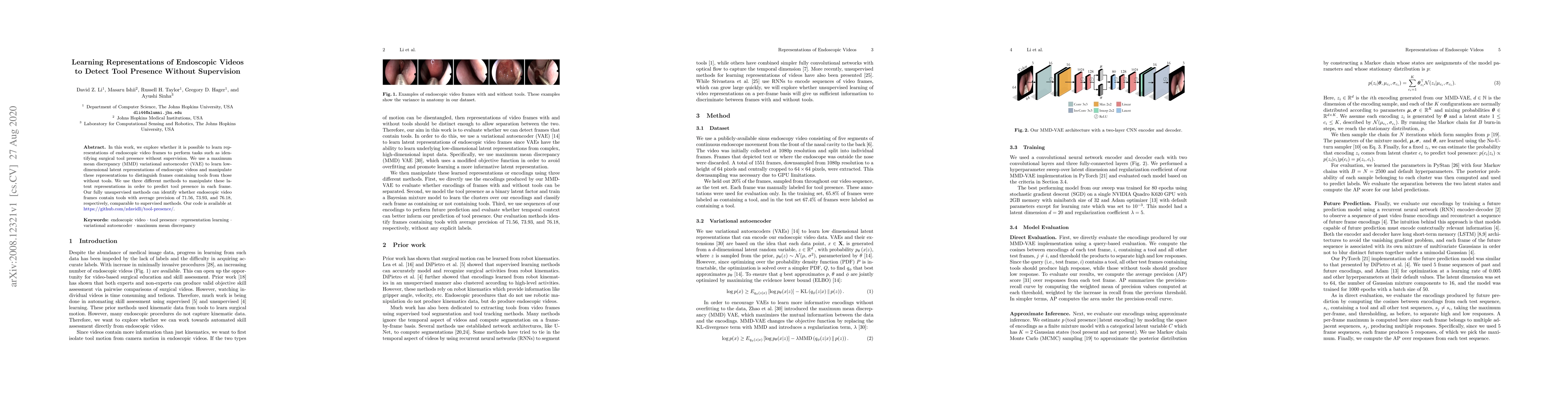 This research investigates unsupervised learning of representations from endoscopic video frames to detect surgical tool presence using a MMD variational autoencoder. The study achieves comparable precision to supervised methods with an average of 76.18% using fully unsupervised techniques.