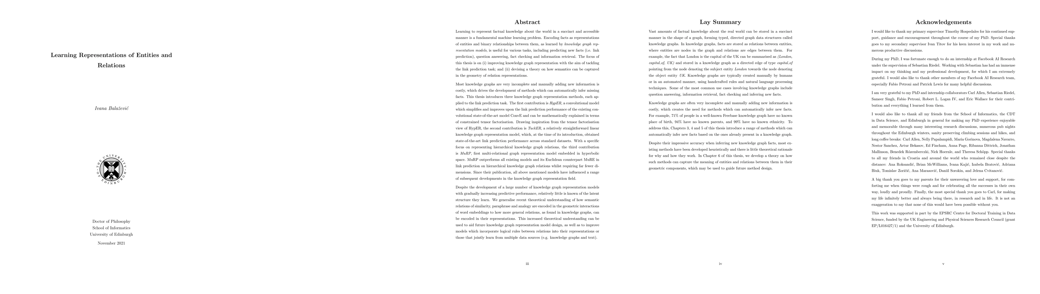 Encoding facts as representations of entities and binary relationships between them, as learned by knowledge graph representation models, is useful for various tasks, including predicting new facts, question answering, fact checking and information retrieval. The focus of this thesis is on (i) improving knowledge graph representation with the aim of tackling the link prediction task; and (ii) devising a theory on how semantics can be captured in the geometry of relation representations. Most knowledge graphs are very incomplete and manually adding new information is costly, which drives the development of methods which can automatically infer missing facts. The first contribution of this thesis is HypER, a convolutional model which simplifies and improves upon the link prediction performance of the existing convolutional state-of-the-art model ConvE and can be mathematically explained in terms of constrained tensor factorisation. The second contribution is TuckER, a relatively straightforward linear model, which, at the time of its introduction, obtained state-of-the-art link prediction performance across standard datasets. The third contribution is MuRP, first multi-relational graph representation model embedded in hyperbolic space. MuRP outperforms all existing models and its Euclidean counterpart MuRE in link prediction on hierarchical knowledge graph relations whilst requiring far fewer dimensions. Despite the development of a large number of knowledge graph representation models with gradually increasing predictive performance, relatively little is known of the latent structure they learn. We generalise recent theoretical understanding of how semantic relations of similarity, paraphrase and analogy are encoded in the geometric interactions of word embeddings to how more general relations, as found in knowledge graphs, can be encoded in their representations.