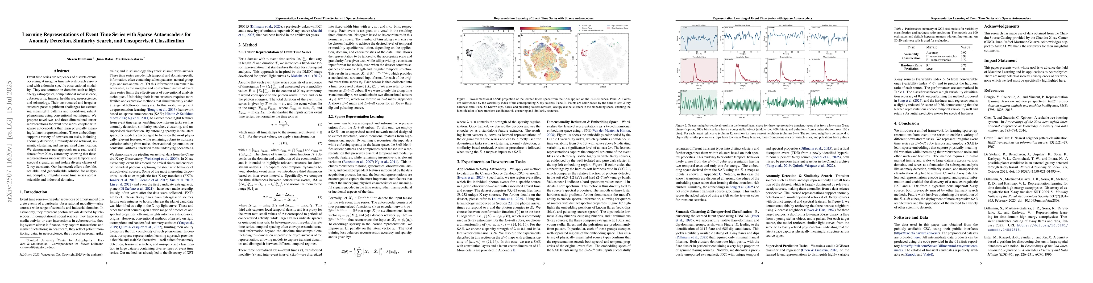 Event time series are sequences of discrete events occurring at irregular time intervals, each associated with a domain-specific observational modality. They are common in domains such as high-energy astrophysics, computational social science, cybersecurity, finance, healthcare, neuroscience, and seismology. Their unstructured and irregular structure poses significant challenges for extracting meaningful patterns and identifying salient phenomena using conventional techniques. We propose novel two- and three-dimensional tensor representations for event time series, coupled with sparse autoencoders that learn physically meaningful latent representations. These embeddings support a variety of downstream tasks, including anomaly detection, similarity-based retrieval, semantic clustering, and unsupervised classification. We demonstrate our approach on a real-world dataset from X-ray astronomy, showing that these representations successfully capture temporal and spectral signatures and isolate diverse classes of X-ray transients. Our framework offers a flexible, scalable, and generalizable solution for analyzing complex, irregular event time series across scientific and industrial domains.
