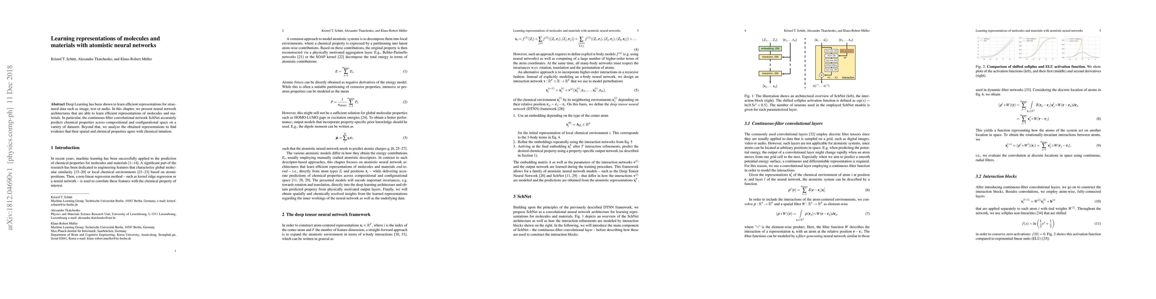This paper introduces neural network architectures, particularly the SchNet convolutional network, for learning efficient representations of molecules and materials, demonstrating its ability to predict chemical properties accurately and aligning these representations with chemical intuition.