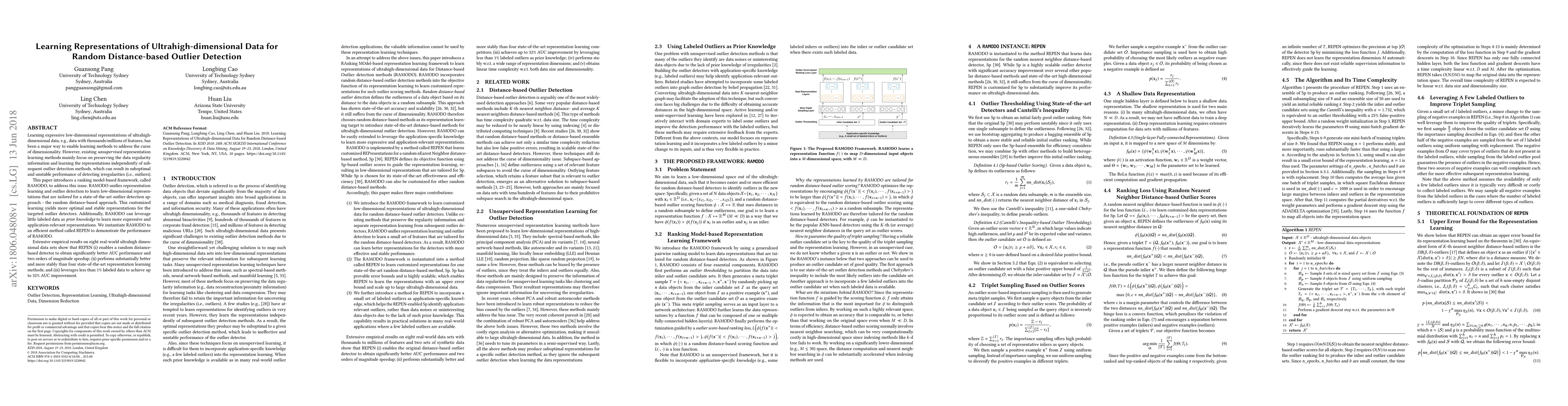 This paper proposes RAMODO, a framework that integrates representation learning with random distance-based outlier detection to create low-dimensional representations optimized for outlier detection. Empirical results show REPEN, an instantiation of RAMODO, significantly improves AUC performance and speed while leveraging minimal labeled data.