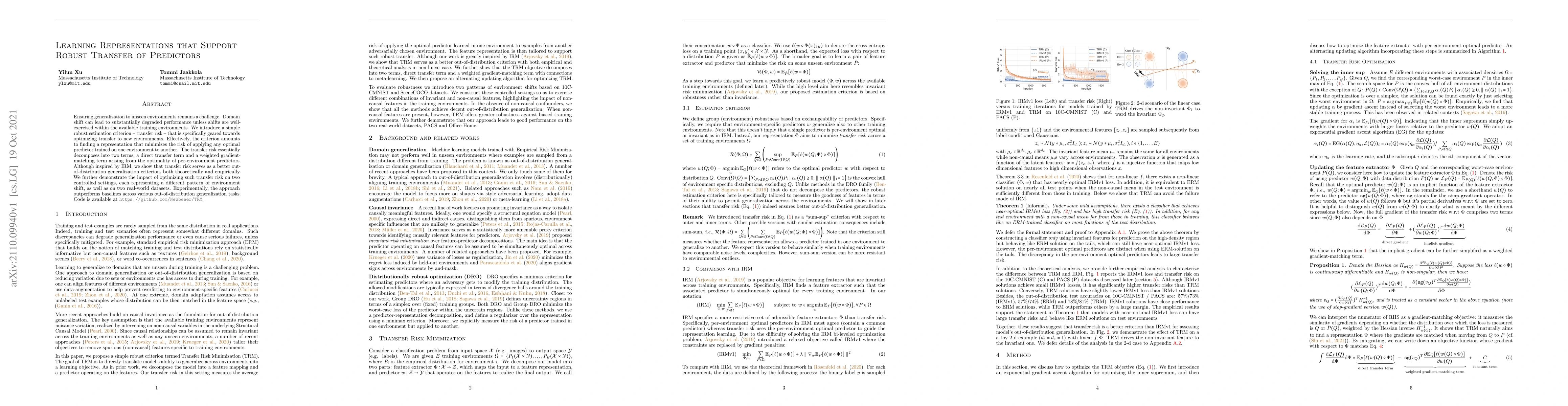 Ensuring generalization to unseen environments remains a challenge. Domain shift can lead to substantially degraded performance unless shifts are well-exercised within the available training environments. We introduce a simple robust estimation criterion -- transfer risk -- that is specifically geared towards optimizing transfer to new environments. Effectively, the criterion amounts to finding a representation that minimizes the risk of applying any optimal predictor trained on one environment to another. The transfer risk essentially decomposes into two terms, a direct transfer term and a weighted gradient-matching term arising from the optimality of per-environment predictors. Although inspired by IRM, we show that transfer risk serves as a better out-of-distribution generalization criterion, both theoretically and empirically. We further demonstrate the impact of optimizing such transfer risk on two controlled settings, each representing a different pattern of environment shift, as well as on two real-world datasets. Experimentally, the approach outperforms baselines across various out-of-distribution generalization tasks. Code is available at \url{https://github.com/Newbeeer/TRM}.
