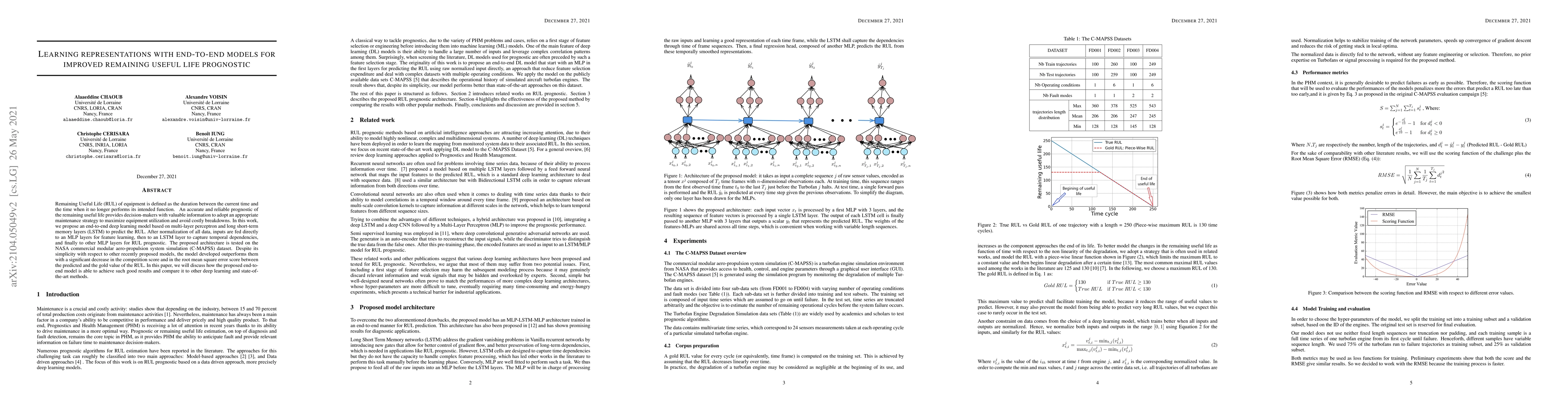 This paper proposes an end-to-end deep learning model combining multi-layer perceptron and LSTM layers to predict the remaining useful life (RUL) of equipment, outperforming other methods on the NASA C-MAPSS dataset. The simplicity of the model leads to significant improvements in accuracy and lower error scores.