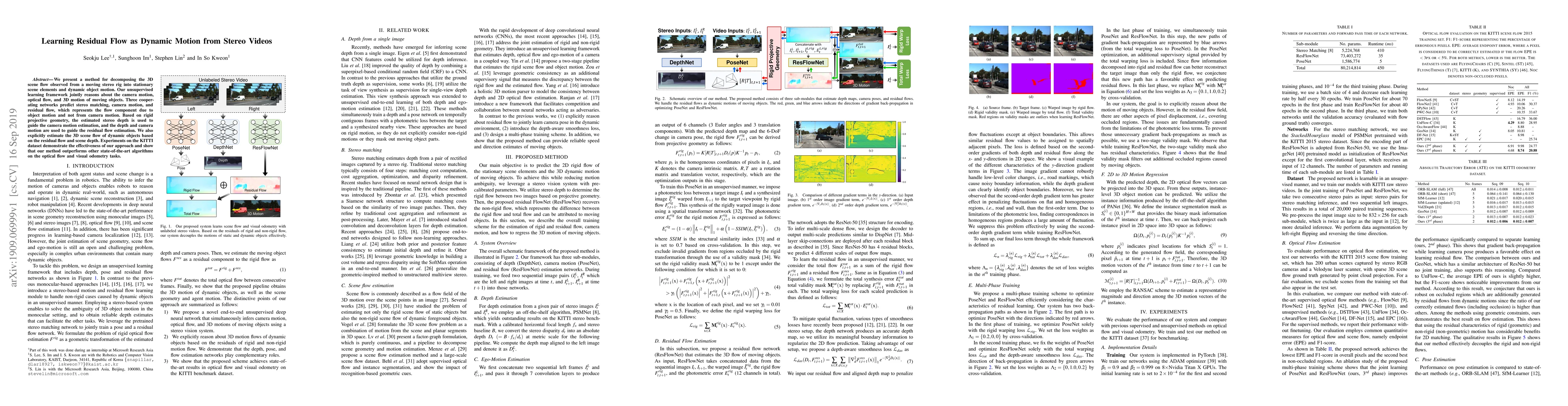This paper proposes an unsupervised learning framework to decompose 3D scene flow from stereo videos into stationary and dynamic components, using three networks to predict stereo matching, camera motion, and residual flow. Experiments on the KITTI dataset show superior performance in optical flow and visual odometry tasks compared to state-of-the-art methods.