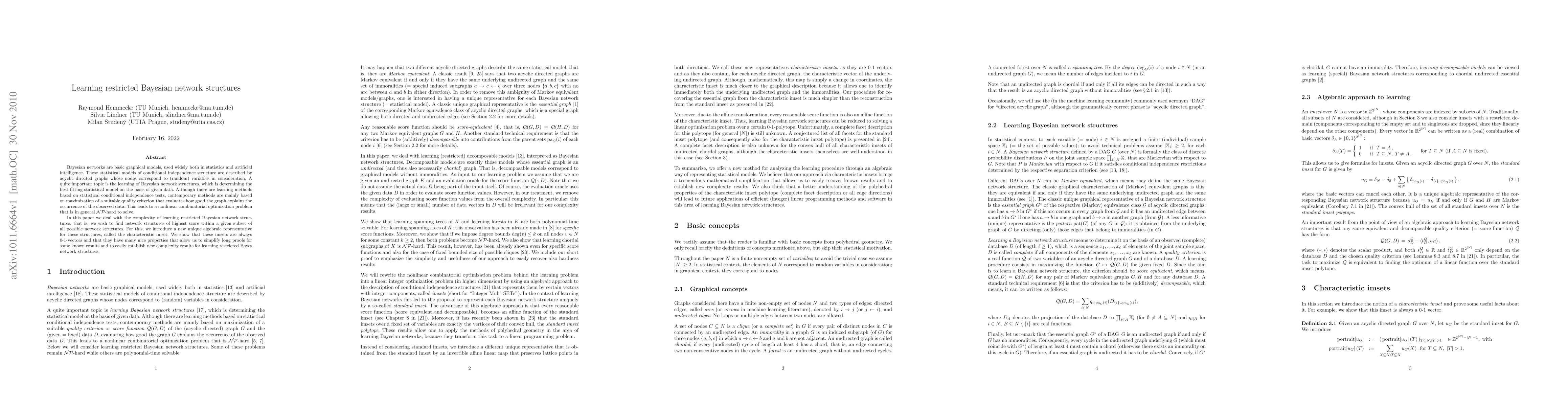 This paper explores the complexity of learning restricted Bayesian network structures using a new algebraic representative called the characteristic imset, which simplifies proofs and establishes new complexity results for the problem. It addresses the NP-hard optimization challenge by focusing on a subset of possible network structures.