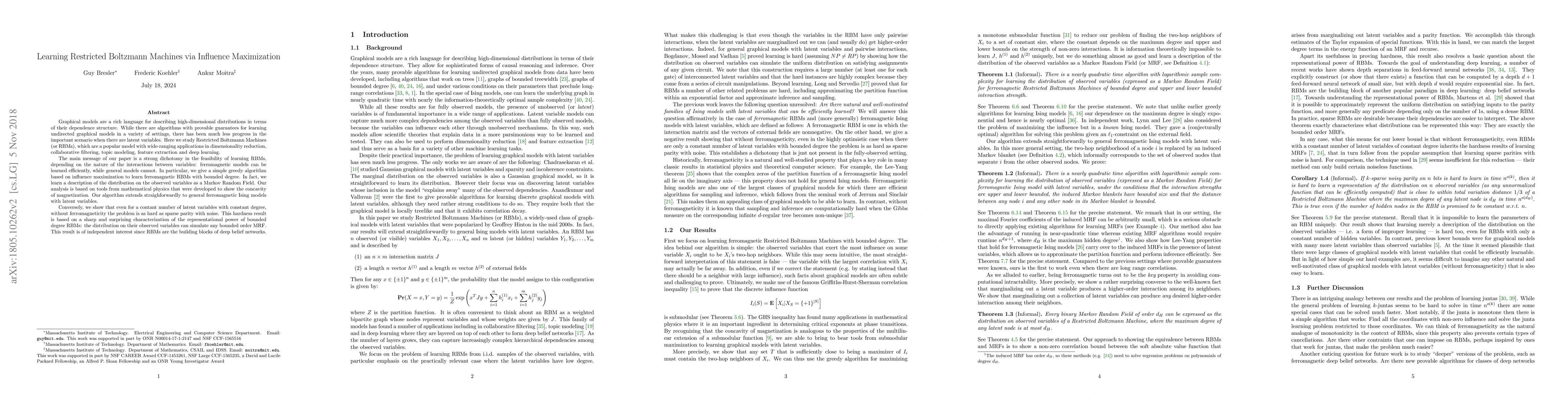 This paper explores the learning of Restricted Boltzmann Machines (RBMs) and finds that efficient learning is feasible for ferromagnetic models, using a greedy algorithm based on influence maximization. Conversely, it demonstrates that learning general RBMs without ferromagneticity is computationally intractable, akin to sparse parity with noise.