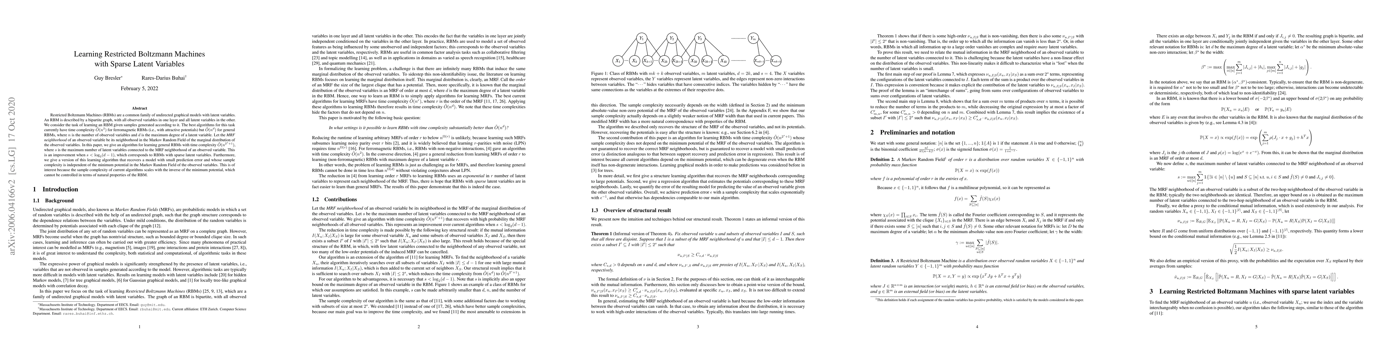 Restricted Boltzmann Machines (RBMs) are a common family of undirected graphical models with latent variables. An RBM is described by a bipartite graph, with all observed variables in one layer and all latent variables in the other. We consider the task of learning an RBM given samples generated according to it. The best algorithms for this task currently have time complexity $\tilde{O}(n^2)$ for ferromagnetic RBMs (i.e., with attractive potentials) but $\tilde{O}(n^d)$ for general RBMs, where $n$ is the number of observed variables and $d$ is the maximum degree of a latent variable. Let the MRF neighborhood of an observed variable be its neighborhood in the Markov Random Field of the marginal distribution of the observed variables. In this paper, we give an algorithm for learning general RBMs with time complexity $\tilde{O}(n^{2^s+1})$, where $s$ is the maximum number of latent variables connected to the MRF neighborhood of an observed variable. This is an improvement when $s < \log_2 (d-1)$, which corresponds to RBMs with sparse latent variables. Furthermore, we give a version of this learning algorithm that recovers a model with small prediction error and whose sample complexity is independent of the minimum potential in the Markov Random Field of the observed variables. This is of interest because the sample complexity of current algorithms scales with the inverse of the minimum potential, which cannot be controlled in terms of natural properties of the RBM.