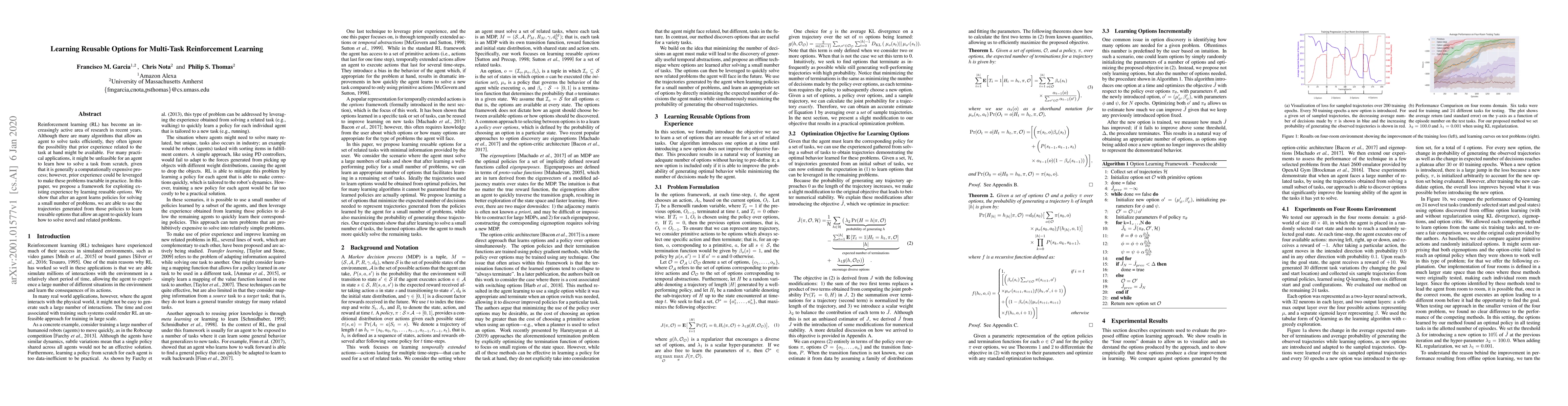 The paper proposes a framework for learning reusable options in multi-task reinforcement learning by leveraging prior experience from learned policies on a set of tasks.