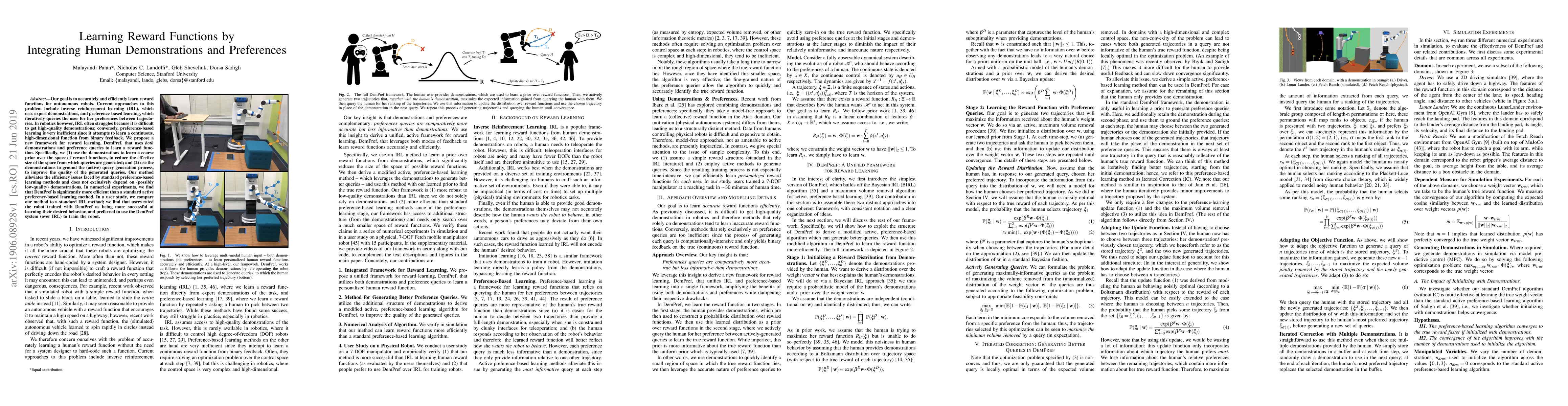 This paper proposes a new framework called DemPref for learning reward functions for autonomous robots by integrating both human demonstrations and preference queries. The method uses demonstrations to create a coarse prior and to guide query generation, improving efficiency and effectiveness over standard preference-based learning methods.