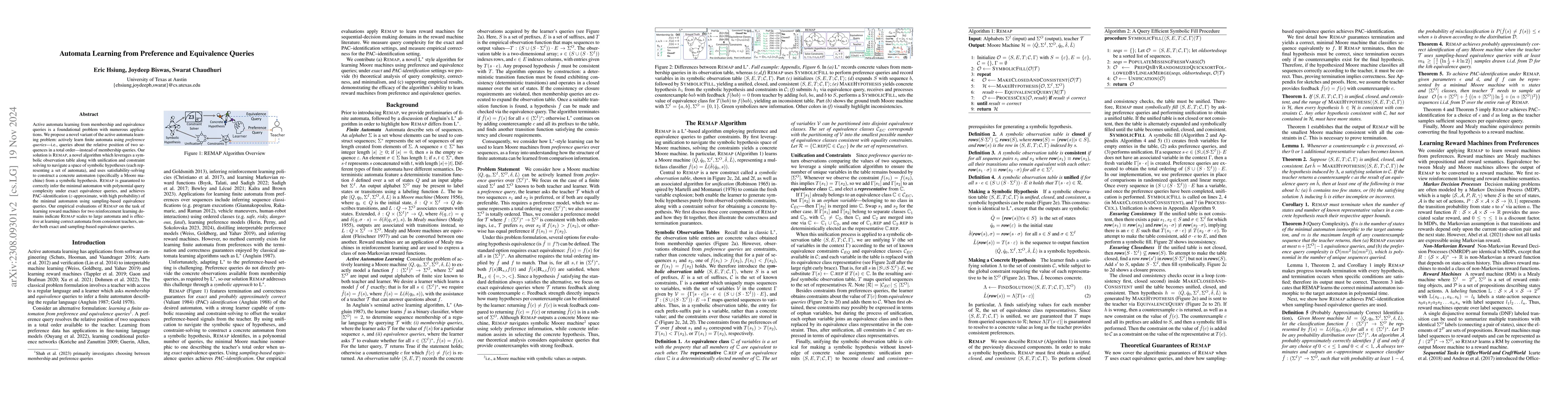 This paper introduces REMAP, a novel algorithm for learning reward machines from preference queries, addressing the lack of existing methods for weak feedback learning. REMAP replaces membership queries with preference queries, utilizing symbolic observation tables and constraint solving to efficiently narrow the search space, with proven correctness and termination guarantees.