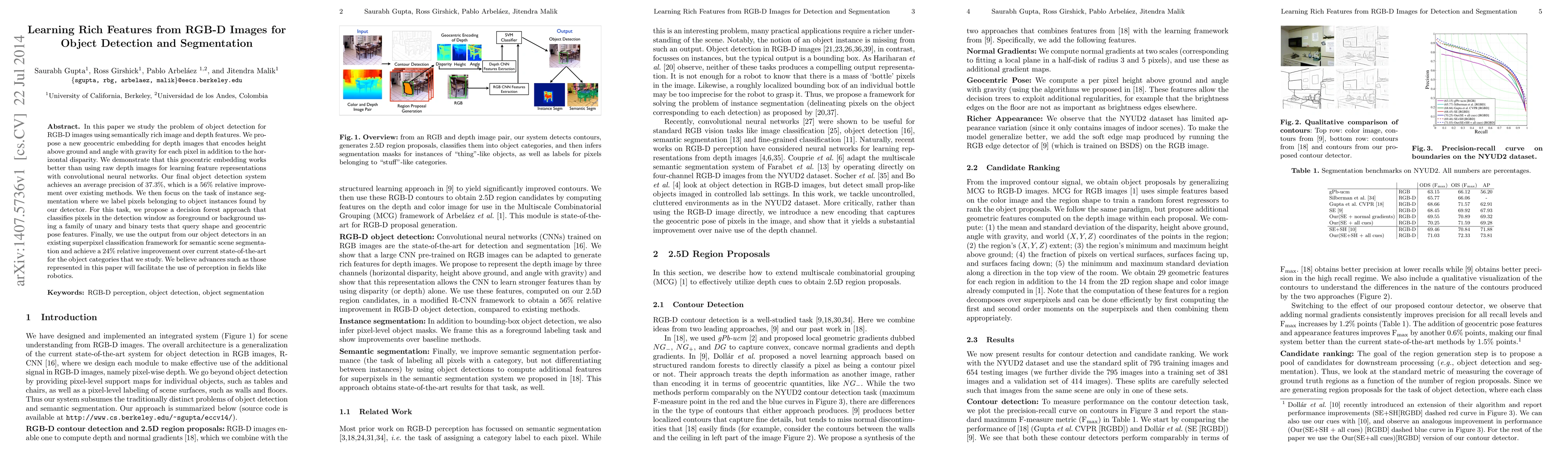 This paper proposes a geocentric embedding for depth images to enhance feature learning for object detection and segmentation in RGB-D images, achieving a 56% relative improvement over existing methods. It also introduces a decision forest approach for instance segmentation and a superpixel classification framework for semantic scene segmentation, resulting in a 24% relative improvement over current state-of-the-art methods.