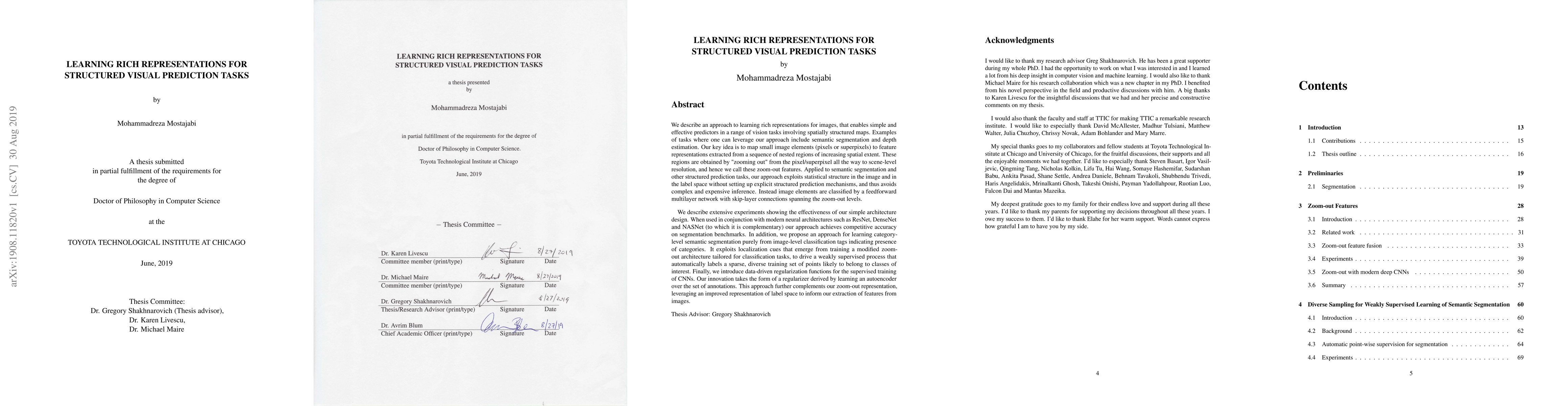 This paper proposes an approach to learning rich image representations using zoom-out features, which map small image elements to representations across nested regions of increasing spatial extent. The method achieves competitive accuracy in structured prediction tasks like semantic segmentation without complex inference, and introduces weakly supervised category-level semantic segmentation and data-driven regularization for CNNs.