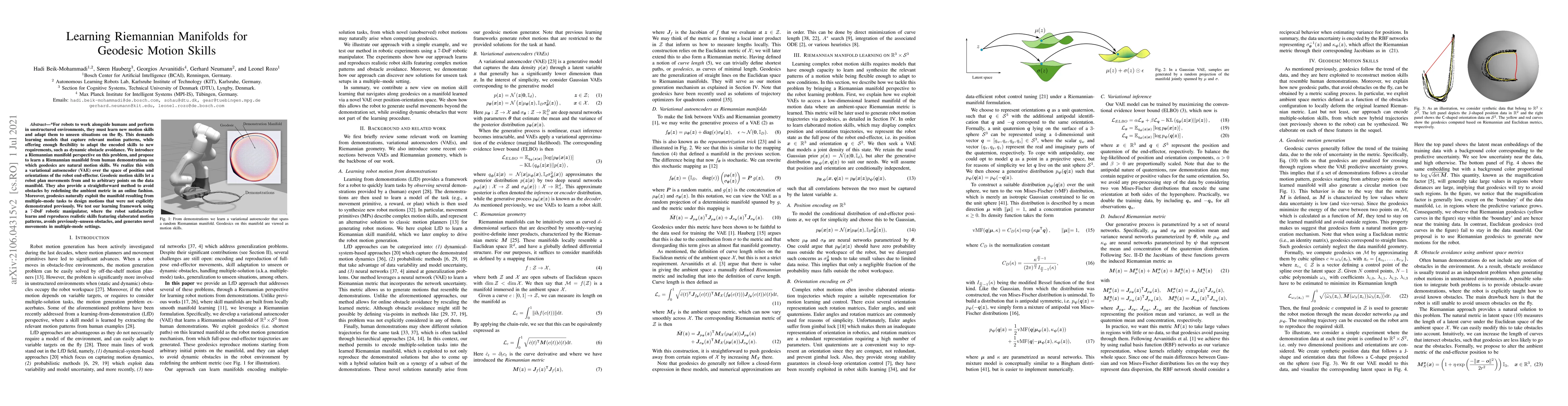 This paper proposes a Riemannian manifold approach to learn geodesic motion skills for robots, using a variational autoencoder to capture motion patterns from human demonstrations. The method enables robots to adapt to new environments and dynamically avoid obstacles, demonstrating successful application on a 7-DoF manipulator.