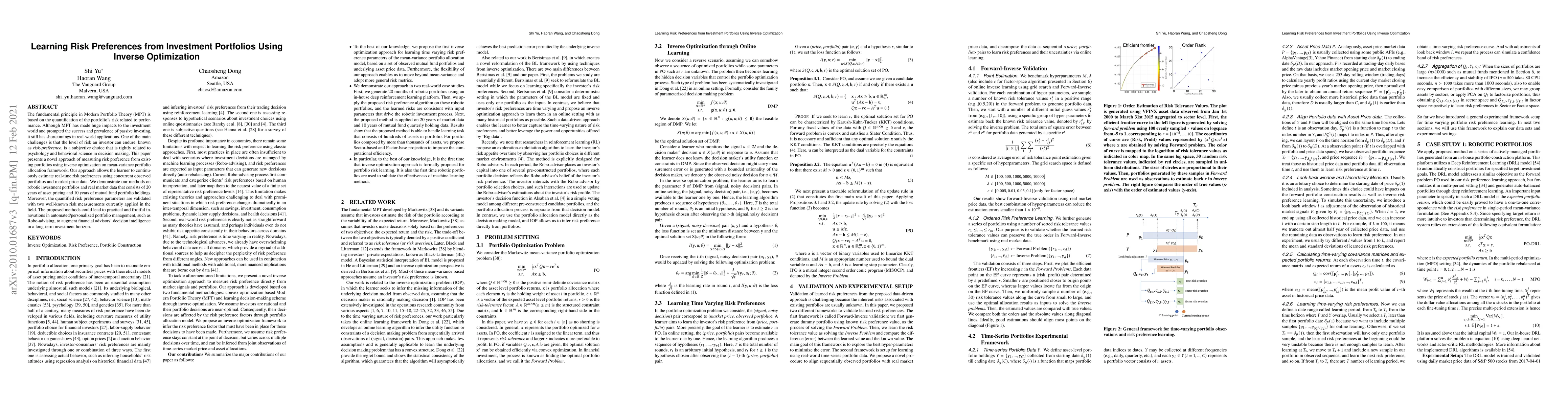 The fundamental principle in Modern Portfolio Theory (MPT) is based on the quantification of the portfolio's risk related to performance. Although MPT has made huge impacts on the investment world and prompted the success and prevalence of passive investing, it still has shortcomings in real-world applications. One of the main challenges is that the level of risk an investor can endure, known as \emph{risk-preference}, is a subjective choice that is tightly related to psychology and behavioral science in decision making. This paper presents a novel approach of measuring risk preference from existing portfolios using inverse optimization on the mean-variance portfolio allocation framework. Our approach allows the learner to continuously estimate real-time risk preferences using concurrent observed portfolios and market price data. We demonstrate our methods on real market data that consists of 20 years of asset pricing and 10 years of mutual fund portfolio holdings. Moreover, the quantified risk preference parameters are validated with two well-known risk measurements currently applied in the field. The proposed methods could lead to practical and fruitful innovations in automated/personalized portfolio management, such as Robo-advising, to augment financial advisors' decision intelligence in a long-term investment horizon.