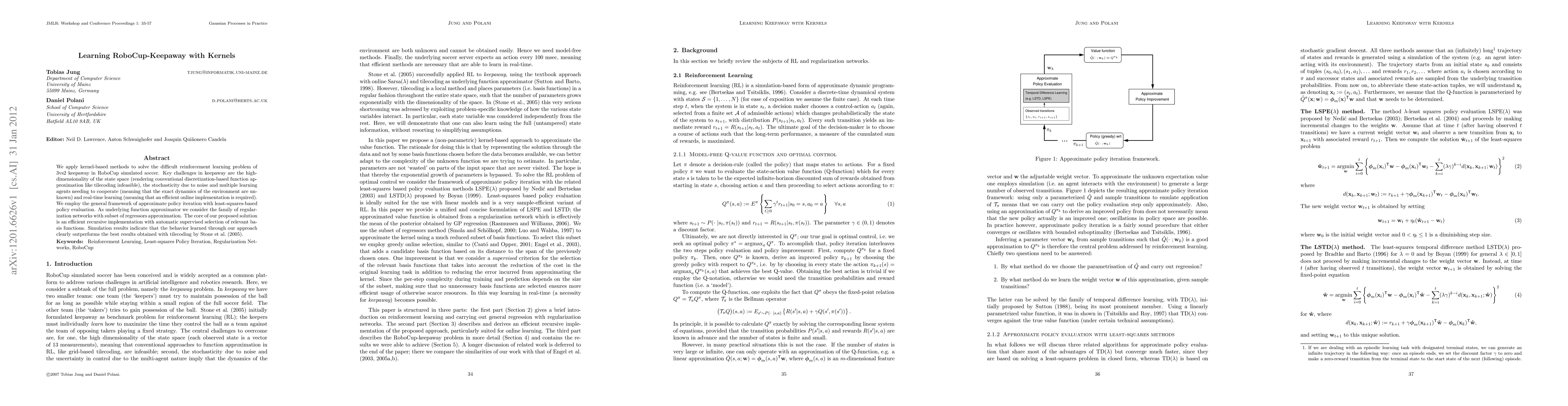 This research paper applies kernel-based methods to solve a challenging reinforcement learning problem in RoboCup Keepaway, achieving results that outperform previous approaches with tilecoding.
