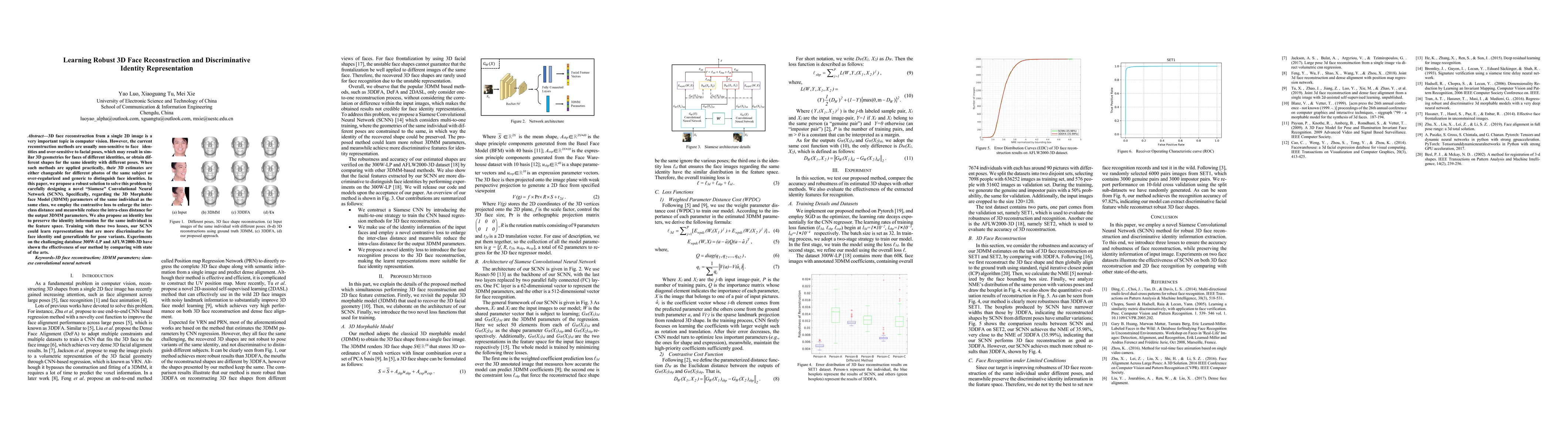 This paper presents a novel Siamese Convolutional Neural Network (SCNN) to address the issue of current 3D face reconstruction methods being non-sensitive to face identities and over-sensitive to facial poses. The proposed method employs contrastive loss to distinguish between different identities and an identity loss to preserve individual identity information. The results, tested on challenging databases, demonstrate the effectiveness of this approach compared to existing methods.