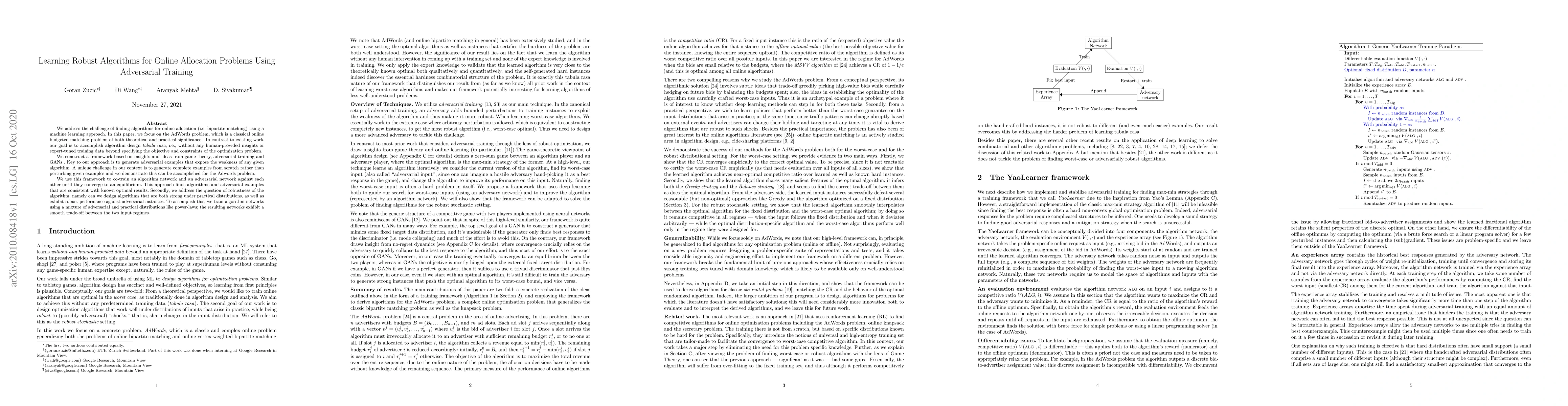 We address the challenge of finding algorithms for online allocation (i.e. bipartite matching) using a machine learning approach. In this paper, we focus on the AdWords problem, which is a classical online budgeted matching problem of both theoretical and practical significance. In contrast to existing work, our goal is to accomplish algorithm design {\em tabula rasa}, i.e., without any human-provided insights or expert-tuned training data beyond specifying the objective and constraints of the optimization problem. We construct a framework based on insights and ideas from game theory, adversarial training and GANs Key to our approach is to generate adversarial examples that expose the weakness of any given algorithm. A unique challenge in our context is to generate complete examples from scratch rather than perturbing given examples and we demonstrate this can be accomplished for the Adwords problem. We use this framework to co-train an algorithm network and an adversarial network against each other until they converge to an equilibrium. This approach finds algorithms and adversarial examples that are consistent with known optimal results. Secondly, we address the question of robustness of the algorithm, namely can we design algorithms that are both strong under practical distributions, as well as exhibit robust performance against adversarial instances. To accomplish this, we train algorithm networks using a mixture of adversarial and practical distributions like power-laws; the resulting networks exhibit a smooth trade-off between the two input regimes.