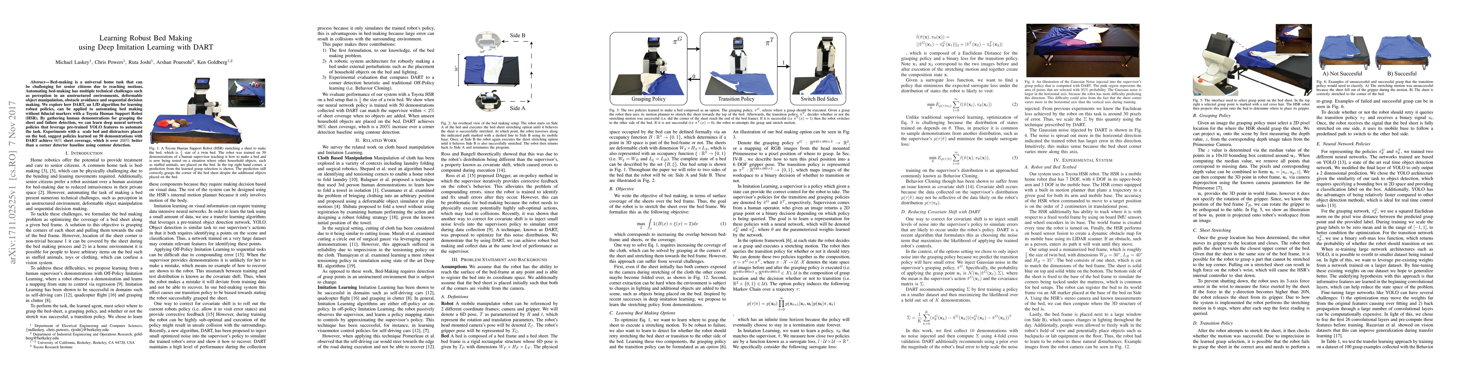 Bed-making is a universal home task that can be challenging for senior citizens due to reaching motions. Automating bed-making has multiple technical challenges such as perception in an unstructured environments, deformable object manipulation, obstacle avoidance and sequential decision making. We explore how DART, an LfD algorithm for learning robust policies, can be applied to automating bed making without fiducial markers with a Toyota Human Support Robot (HSR). By gathering human demonstrations for grasping the sheet and failure detection, we can learn deep neural network policies that leverage pre-trained YOLO features to automate the task. Experiments with a 1/2 scale twin bed and distractors placed on the bed, suggest policies learned on 50 demonstrations with DART achieve 96% sheet coverage, which is over 200% better than a corner detector baseline using contour detection.