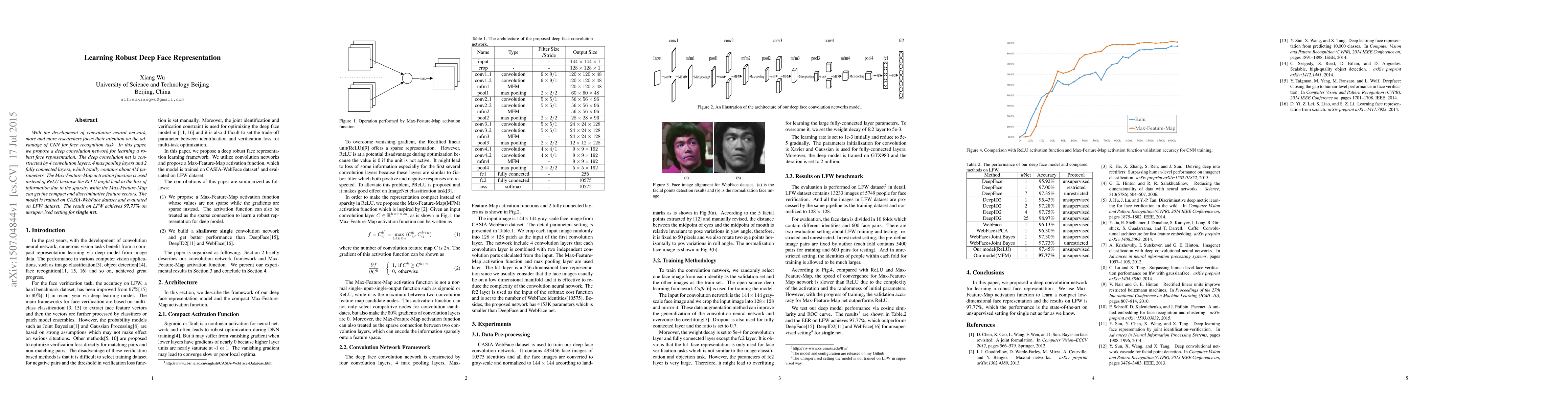 This work proposes a novel deep convolution network architecture using Max-Feature-Map activation function for robust face representation.