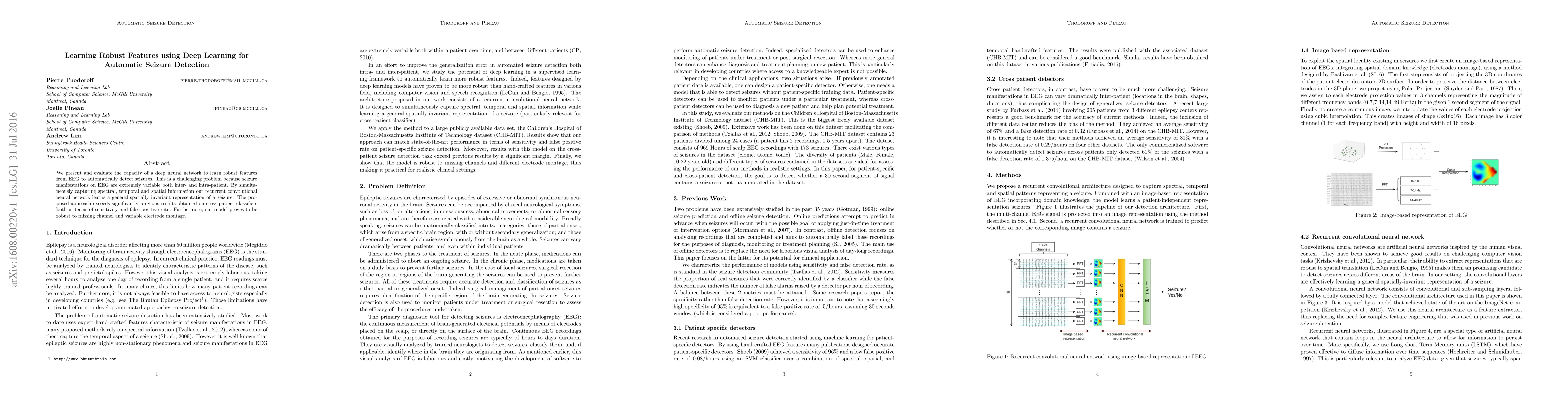 This paper proposes a recurrent convolutional neural network to learn robust features from EEG data for automatic seizure detection, achieving superior performance in sensitivity and false positive rate compared to previous methods, and demonstrating robustness to missing channels and variable electrode montages.