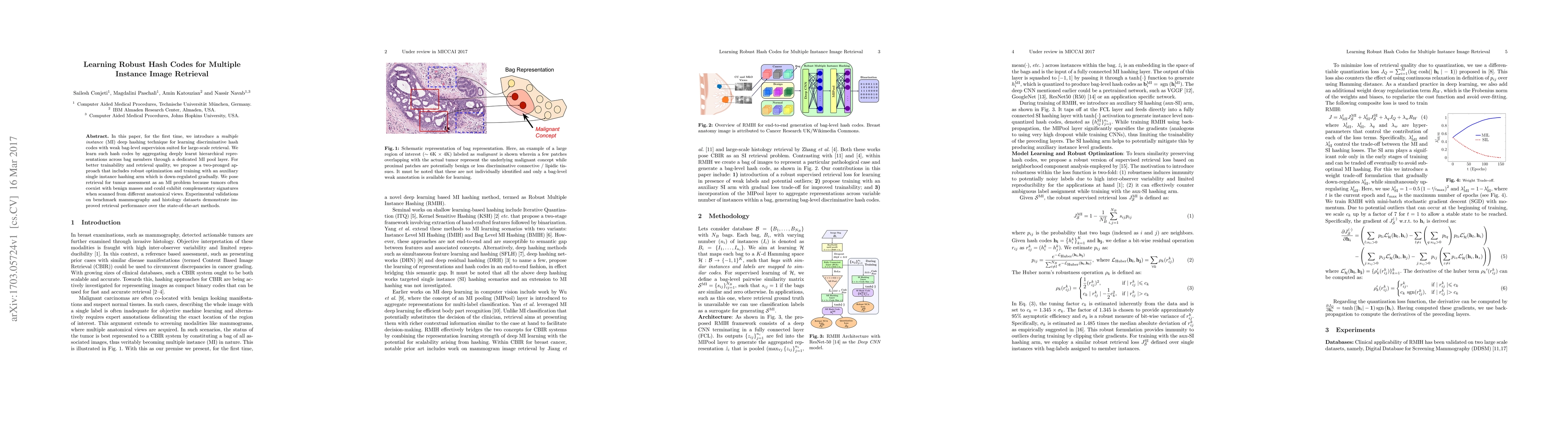 In this paper, for the first time, we introduce a multiple instance (MI) deep hashing technique for learning discriminative hash codes with weak bag-level supervision suited for large-scale retrieval. We learn such hash codes by aggregating deeply learnt hierarchical representations across bag members through a dedicated MI pool layer. For better trainability and retrieval quality, we propose a two-pronged approach that includes robust optimization and training with an auxiliary single instance hashing arm which is down-regulated gradually. We pose retrieval for tumor assessment as an MI problem because tumors often coexist with benign masses and could exhibit complementary signatures when scanned from different anatomical views. Experimental validations on benchmark mammography and histology datasets demonstrate improved retrieval performance over the state-of-the-art methods.