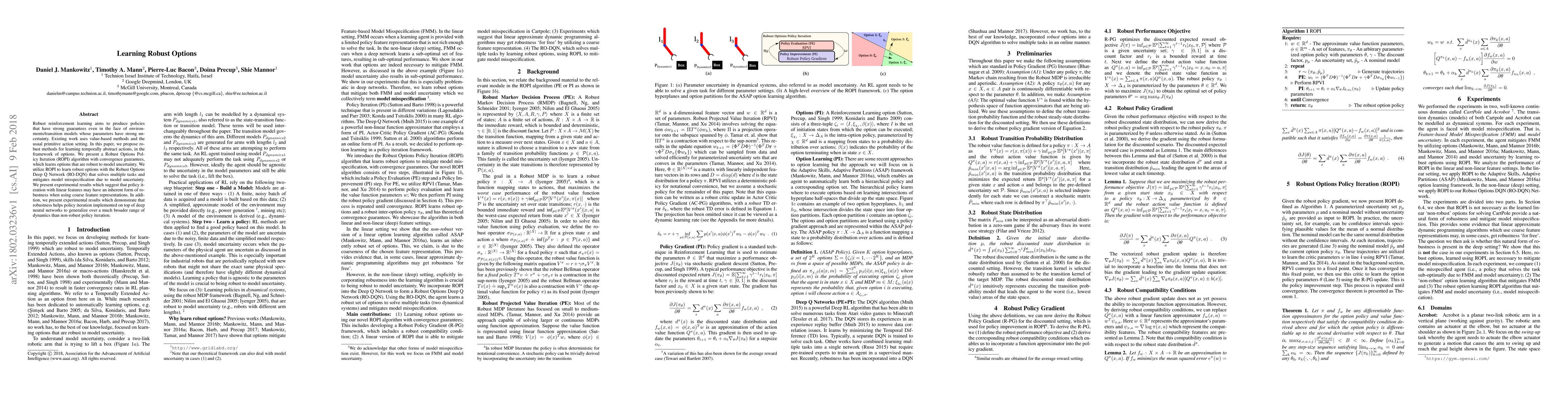 This paper proposes robust methods for learning temporally abstract actions using options in reinforcement learning, introducing the Robust Options Policy Iteration (ROPI) algorithm and the Robust Options Deep Q Network (RO-DQN) to handle model uncertainty. Experimental results show that robust policy iteration generalizes better than non-robust methods.
