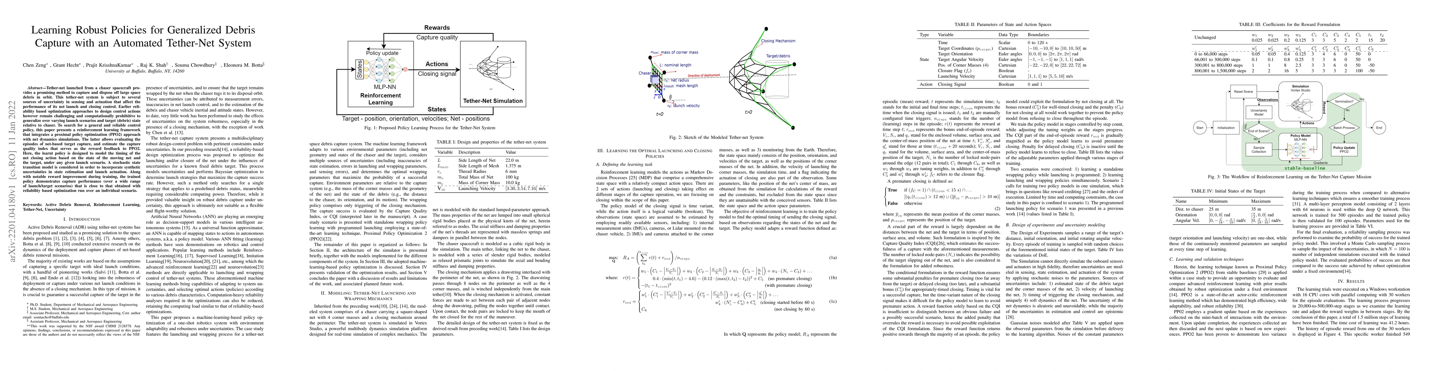 This paper develops a reinforcement learning framework using proximal policy optimization to create robust control policies for an automated tether-net system for capturing space debris. The approach effectively models the timing of net closing actions under various launch scenarios, achieving capture performance comparable to traditional optimization methods.
