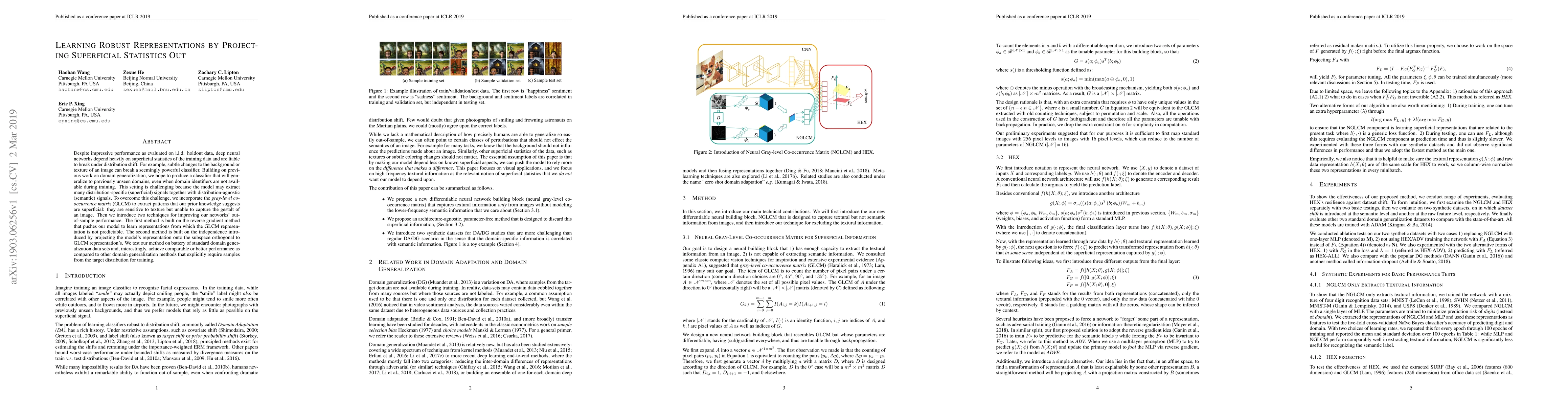 Despite impressive performance as evaluated on i.i.d. holdout data, deep neural networks depend heavily on superficial statistics of the training data and are liable to break under distribution shift. For example, subtle changes to the background or texture of an image can break a seemingly powerful classifier. Building on previous work on domain generalization, we hope to produce a classifier that will generalize to previously unseen domains, even when domain identifiers are not available during training. This setting is challenging because the model may extract many distribution-specific (superficial) signals together with distribution-agnostic (semantic) signals. To overcome this challenge, we incorporate the gray-level co-occurrence matrix (GLCM) to extract patterns that our prior knowledge suggests are superficial: they are sensitive to the texture but unable to capture the gestalt of an image. Then we introduce two techniques for improving our networks' out-of-sample performance. The first method is built on the reverse gradient method that pushes our model to learn representations from which the GLCM representation is not predictable. The second method is built on the independence introduced by projecting the model's representation onto the subspace orthogonal to GLCM representation's. We test our method on the battery of standard domain generalization data sets and, interestingly, achieve comparable or better performance as compared to other domain generalization methods that explicitly require samples from the target distribution for training.