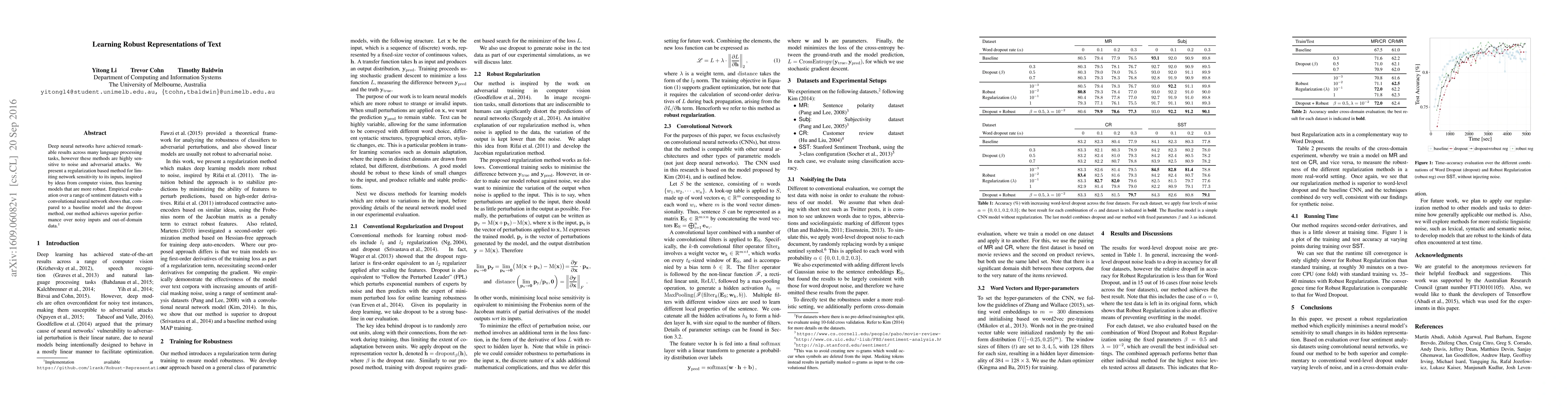Deep neural networks have achieved remarkable results across many language processing tasks, however these methods are highly sensitive to noise and adversarial attacks. We present a regularization based method for limiting network sensitivity to its inputs, inspired by ideas from computer vision, thus learning models that are more robust. Empirical evaluation over a range of sentiment datasets with a convolutional neural network shows that, compared to a baseline model and the dropout method, our method achieves superior performance over noisy inputs and out-of-domain data.