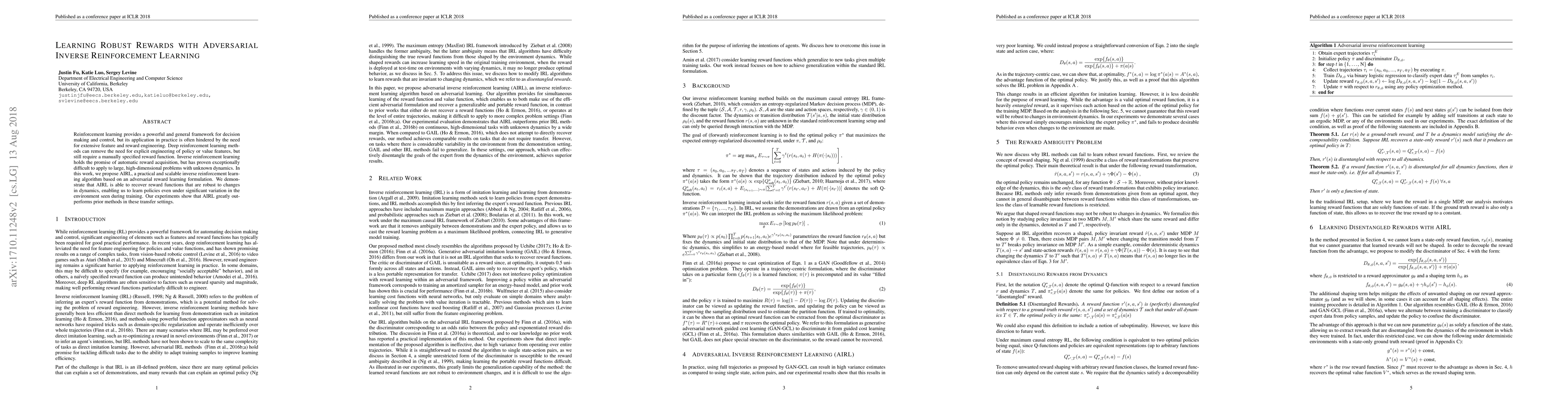 This paper proposes adversarial inverse reinforcement learning (AIRL) to automatically acquire robust reward functions, overcoming the limitations of traditional methods in high-dimensional environments. AIRL demonstrates superior performance in learning policies that generalize well under significant environmental changes.