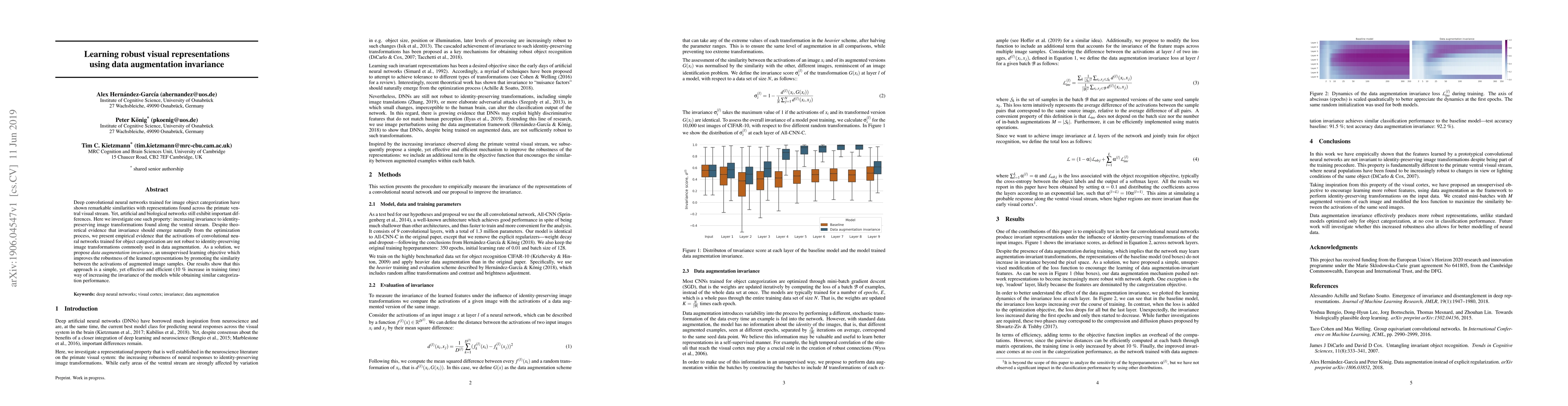 Deep convolutional neural networks trained for image object categorization have shown remarkable similarities with representations found across the primate ventral visual stream. Yet, artificial and biological networks still exhibit important differences. Here we investigate one such property: increasing invariance to identity-preserving image transformations found along the ventral stream. Despite theoretical evidence that invariance should emerge naturally from the optimization process, we present empirical evidence that the activations of convolutional neural networks trained for object categorization are not robust to identity-preserving image transformations commonly used in data augmentation. As a solution, we propose data augmentation invariance, an unsupervised learning objective which improves the robustness of the learned representations by promoting the similarity between the activations of augmented image samples. Our results show that this approach is a simple, yet effective and efficient (10 % increase in training time) way of increasing the invariance of the models while obtaining similar categorization performance.