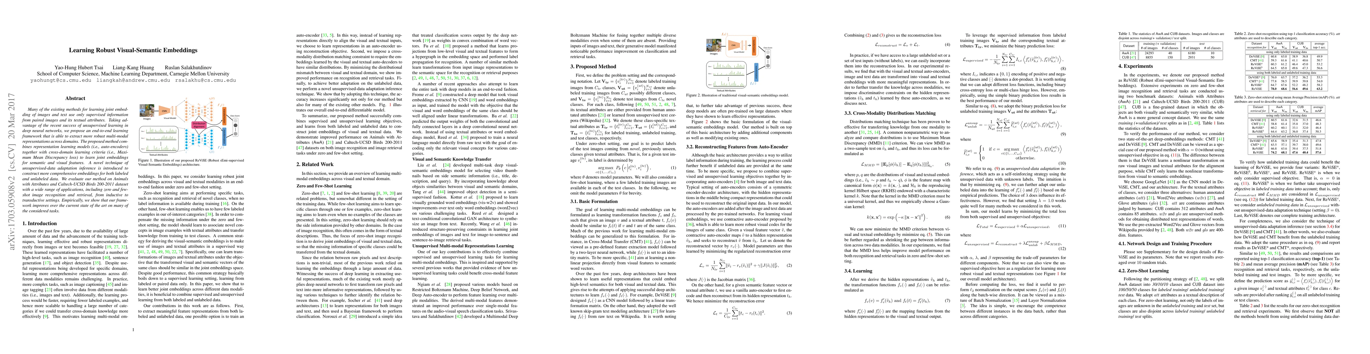 This paper proposes an end-to-end framework for learning robust visual-semantic embeddings by combining unsupervised learning with auto-encoders and cross-domain criteria. The method demonstrates superior performance in various applications, including zero and few-shot recognition, outperforming current state-of-the-art techniques.