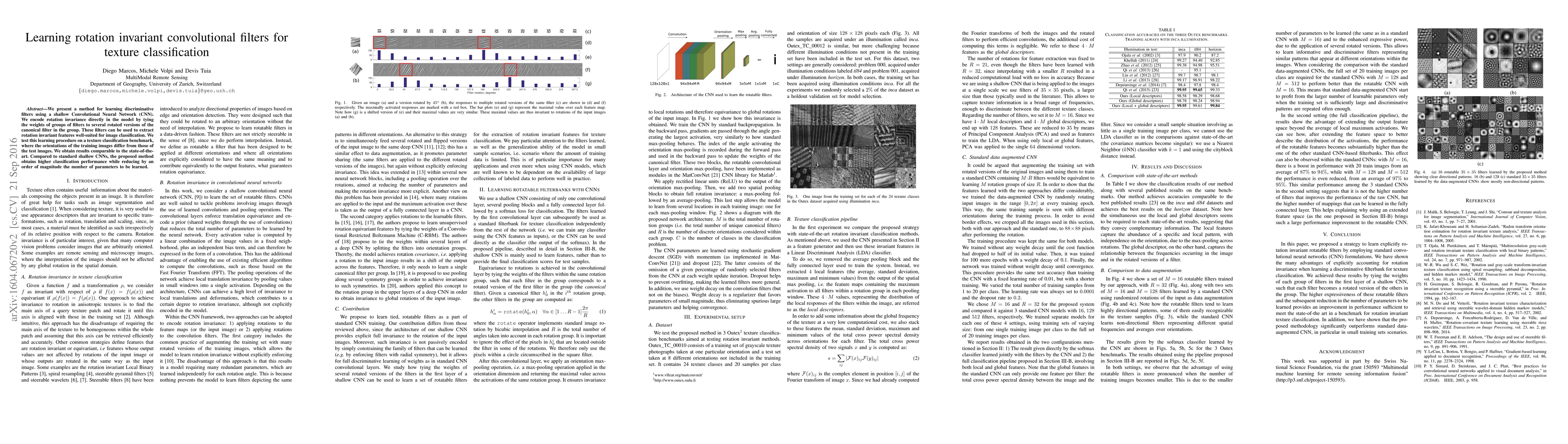 This paper proposes a method for learning rotation invariant convolutional filters using a shallow CNN, achieving higher classification performance and significantly fewer parameters compared to standard CNNs, tested on a texture classification benchmark.