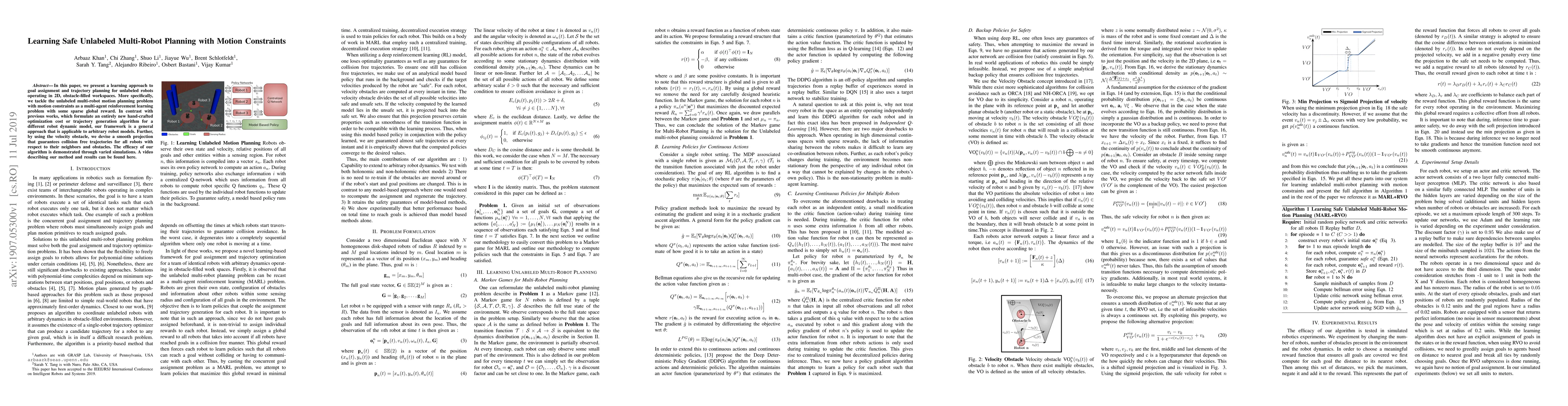 In this paper, we present a learning approach to goal assignment and trajectory planning for unlabeled robots operating in 2D, obstacle-filled workspaces. More specifically, we tackle the unlabeled multi-robot motion planning problem with motion constraints as a multi-agent reinforcement learning problem with some sparse global reward. In contrast with previous works, which formulate an entirely new hand-crafted optimization cost or trajectory generation algorithm for a different robot dynamic model, our framework is a general approach that is applicable to arbitrary robot models. Further, by using the velocity obstacle, we devise a smooth projection that guarantees collision free trajectories for all robots with respect to their neighbors and obstacles. The efficacy of our algorithm is demonstrated through varied simulations.